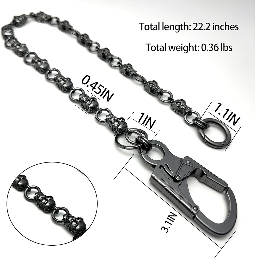 SIZE:The total length of the wallet chain is 22.2 inches, the width is 0.45 inches, and the weight is about 0.36 lbs.Double locking carabiner design, you can hang your keys, wallet, and all your daily necessities on your belt loop, purse or handbag, prevent your wallet or keys from falling out of your pocket