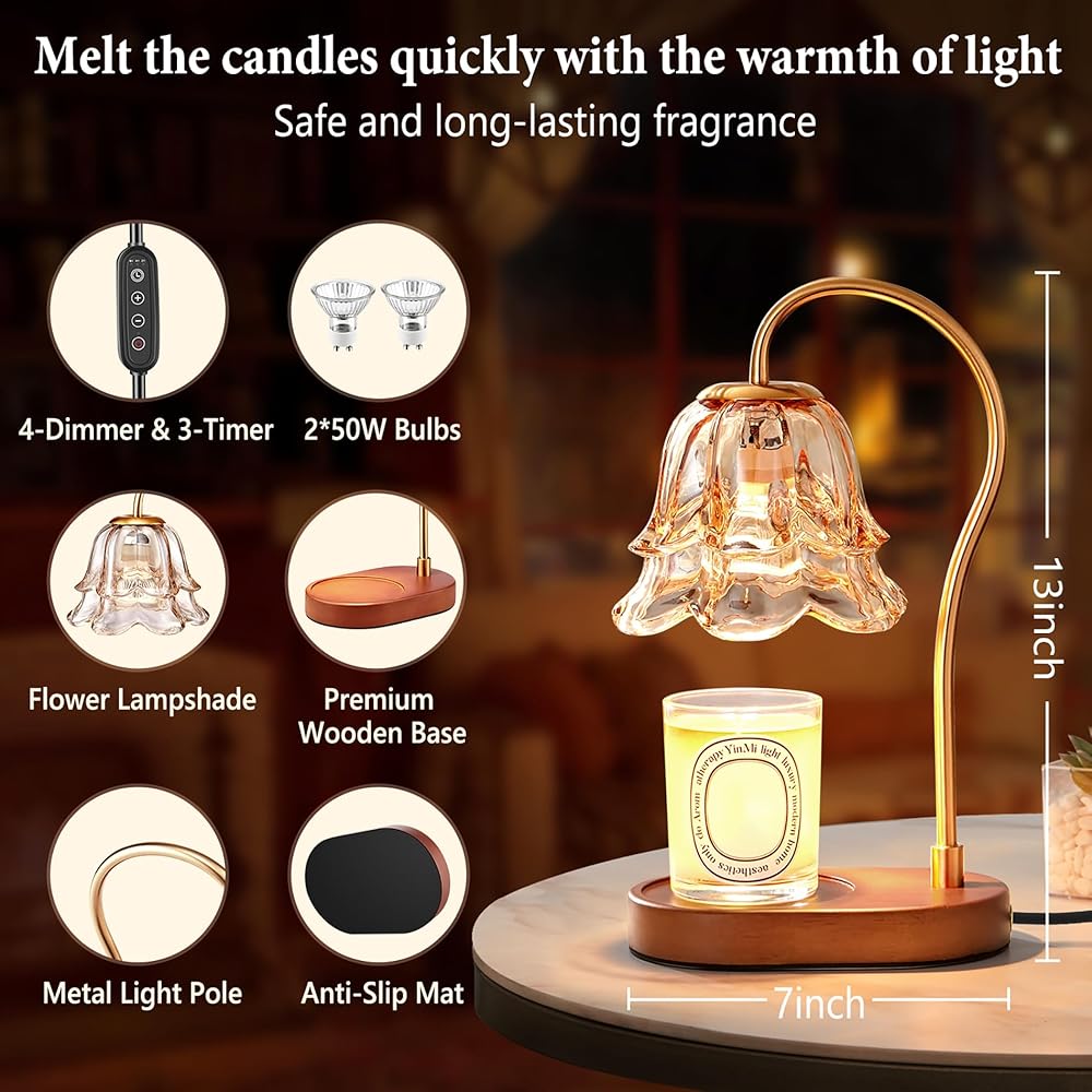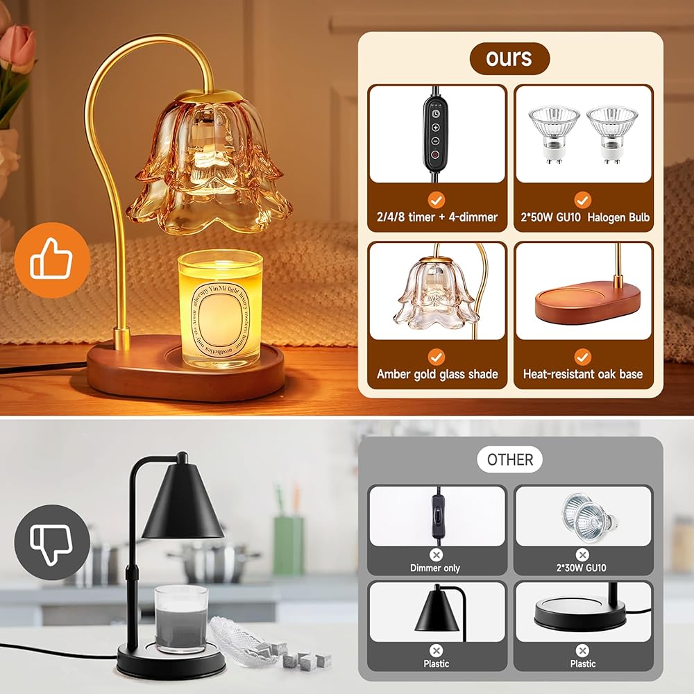 【🏠Safety & Eco-Friendly Candle Warmer Lamp】The electric candle warmer lamp with timer works on a 50-watt halogen warming bulb (Included 2*50W bulbs) melts the candle, wax melt warmer provide a consistent strong and clean scent. Candle warmer lamp with timer compared traditional burning, electric candle warmer can easily melt candles to enjoy the fragrance without open flames, smoke, soot or pollution, candle lamp warmer protecting your house and family by keeping them safe from fire hazards.