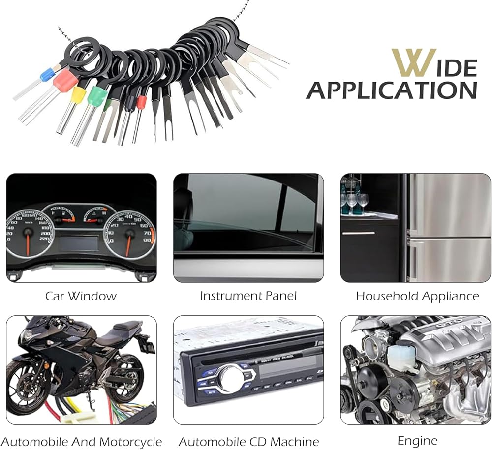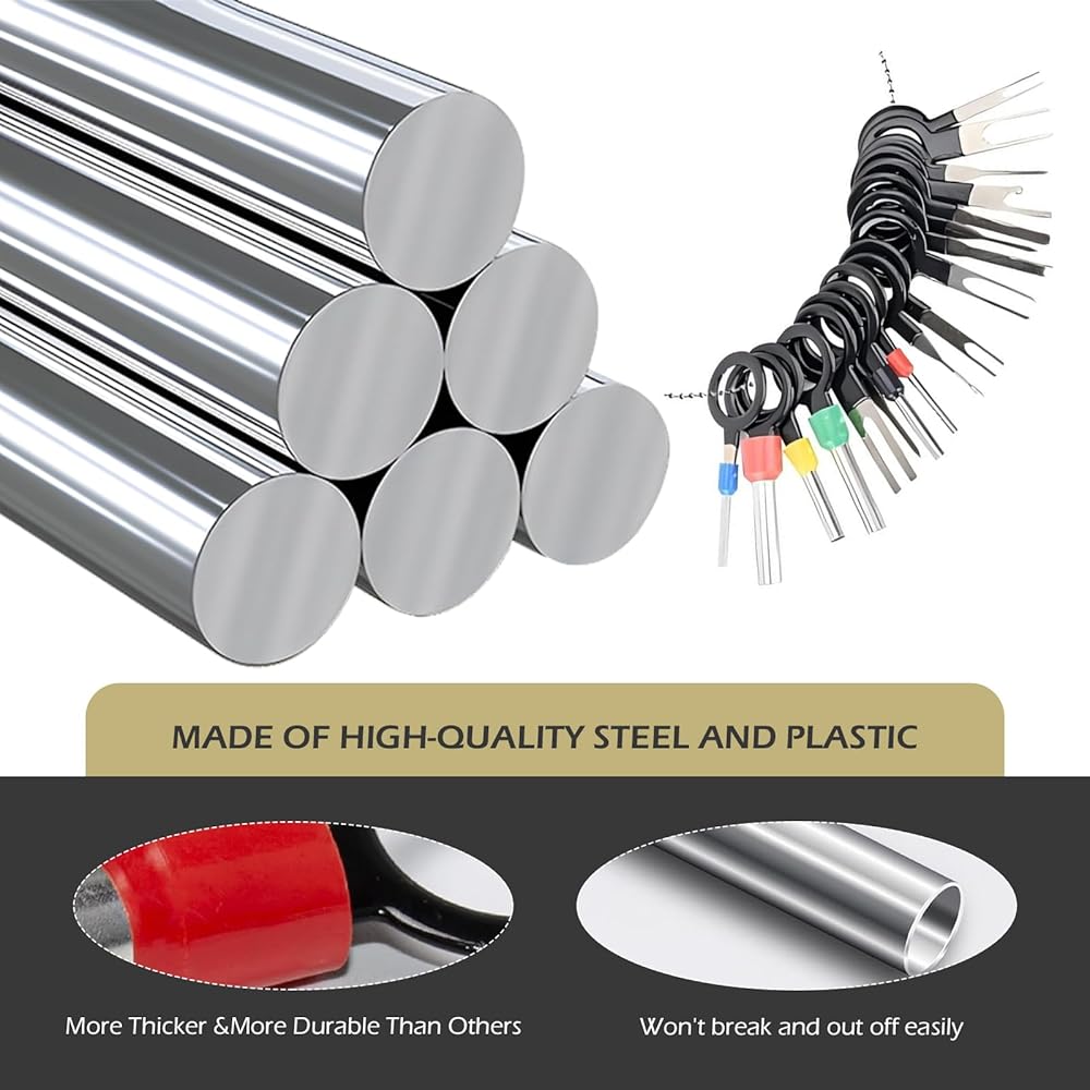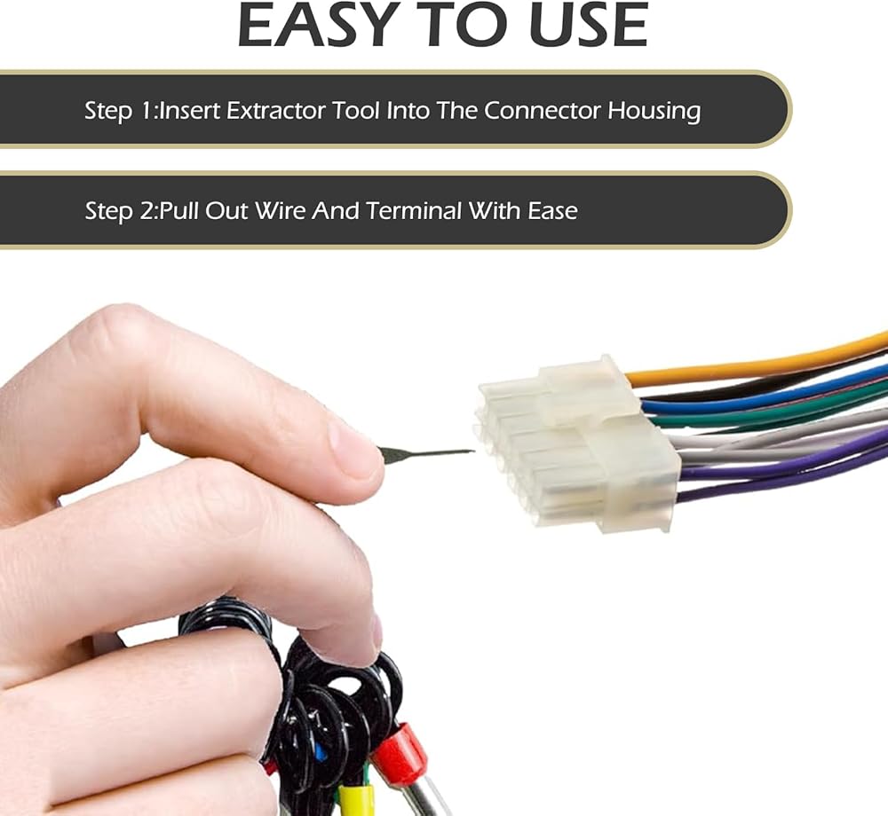 The wire removal tool kit is easy to use, simply push and pull the terminal pins with the connector removal tool to effortlessly remove them from the harness connector without causing any damage.