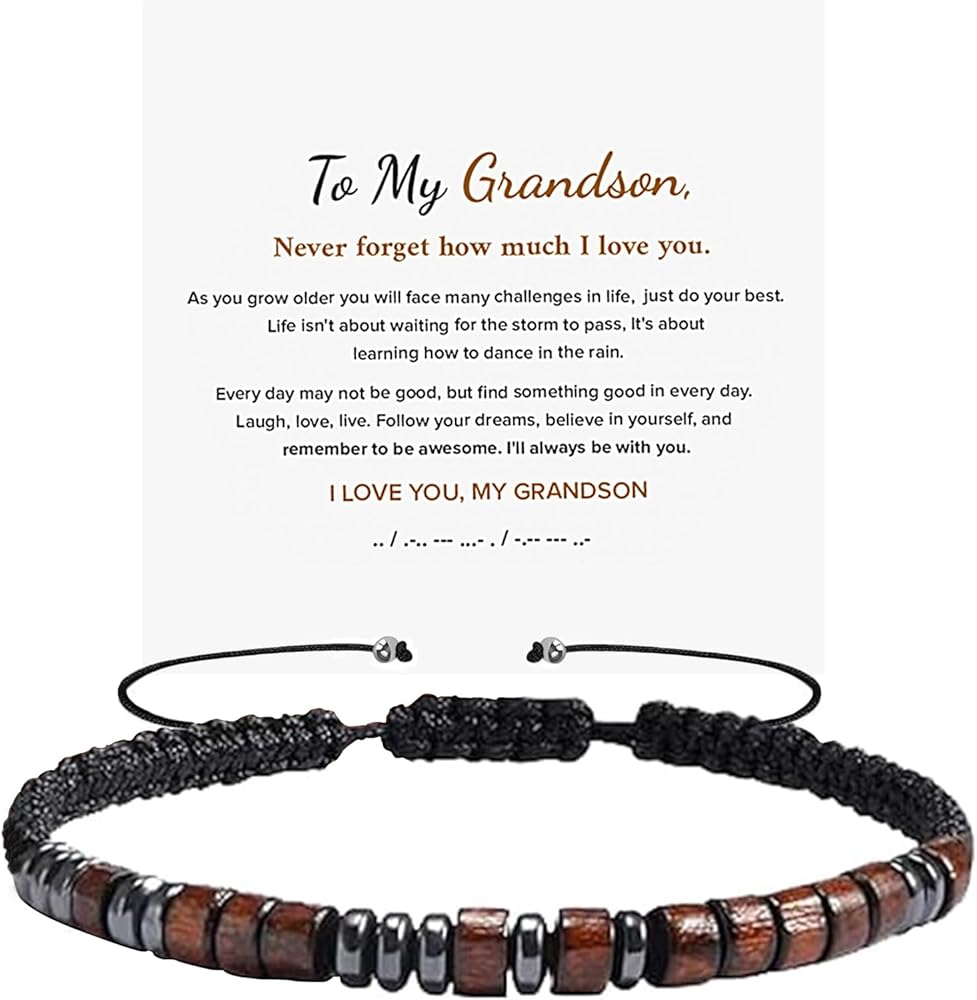 to My Grandson Bracelet Personalized Grandson Birthday Valentines Easter Graduation Christmas Gifts from Grandma, Gifts for Teen Boys I Love You Morse Code Bracelet With Wallet Cards
