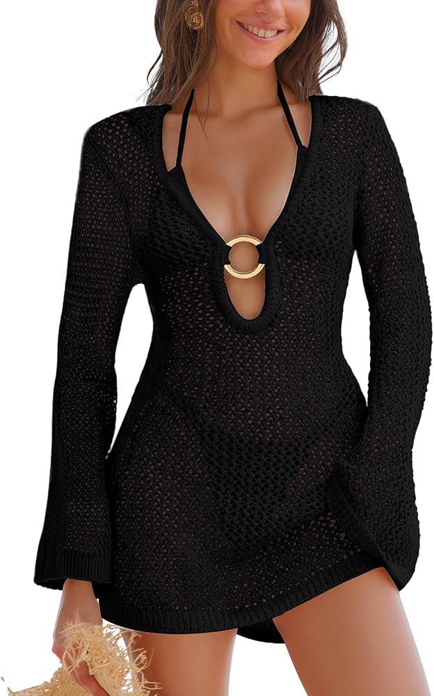 "Versatile Swimsuit Coverup & Vacation Dress 2-in-1 Convert seamlessly from swim coverup to vacation dress.Deep V-long sleeves and crochet pattern flatter all body types for cruises, spring breaks, or resorts. Layer over bikinis or style with sandals for Instagram beach outfits—ideal for summer adventures."