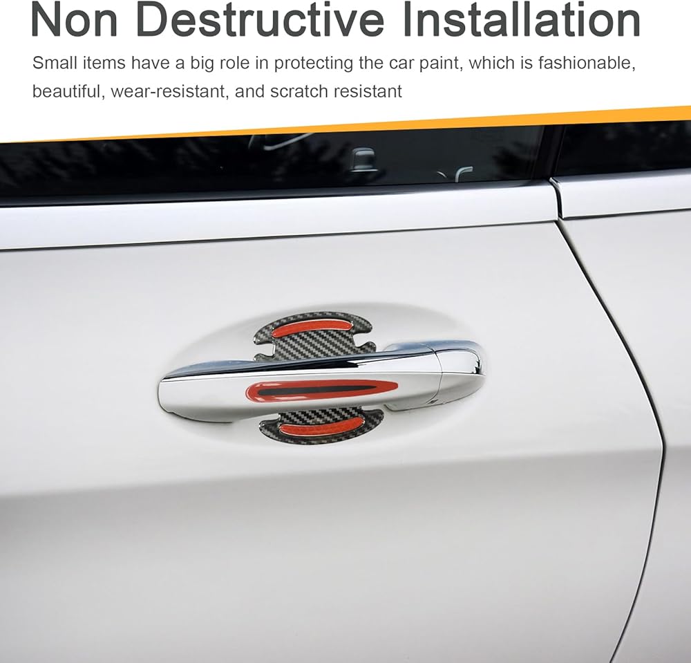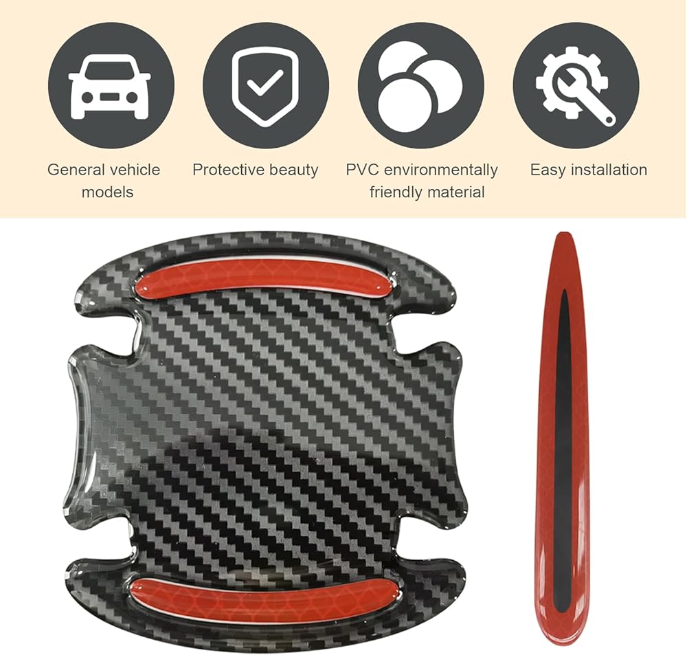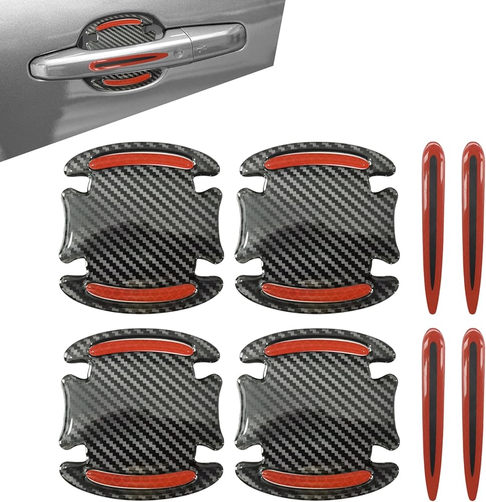 Sumjig 8 PCS Car Door Handle Door Bowl Protector, 3.54" x 3.26" + 0.59" x 3.54" Carbon Fiber Reflective Warning Sticker, Paint Surface Anti-scratch Flexible Decal, Universal for Cars (Red)
