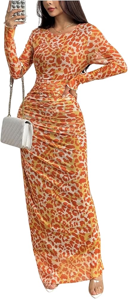 - Features: Maxi dress for women, leopard print, cheetah print, round neck, long sleeves, mesh, sheer, slim fitted, fashionable