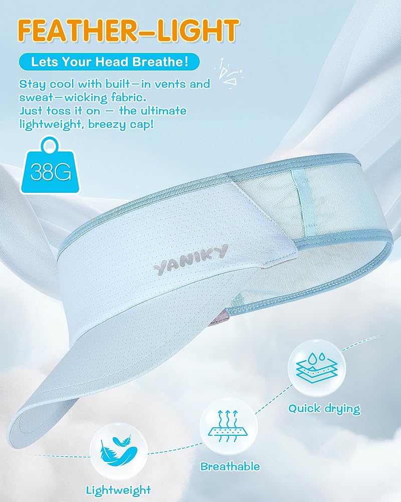 【Lightweight & Moldable Brim】The sun visor's brim uses soft EVA plastic—flexible enough to prevent scrapes or bumps, yet sturdy enough to hold its shape. Just mold it by hand to get the perfect curve for sun coverage and keep your view wide open, no blind spots. Weighing just 38g, this ultra-light design offers completely comfortable wear for all summer outdoor adventures.