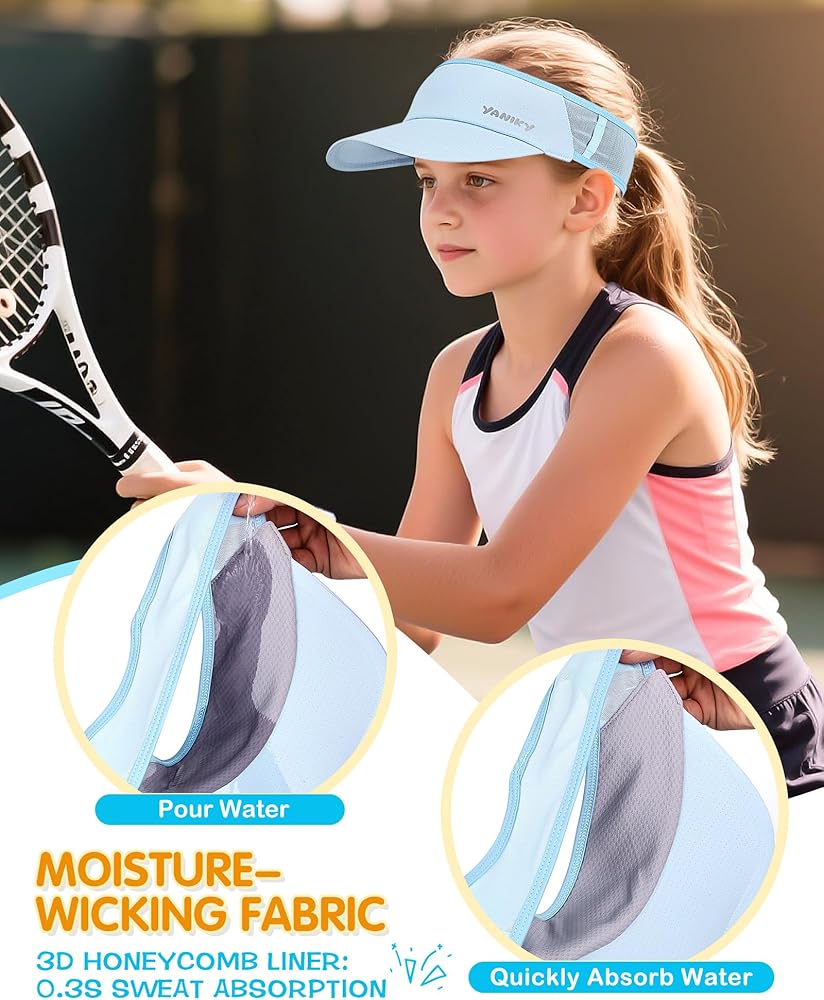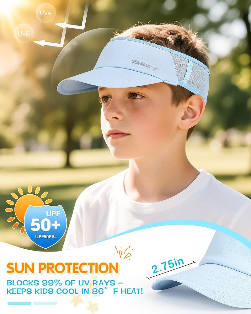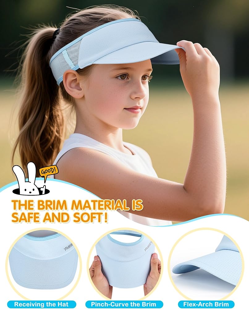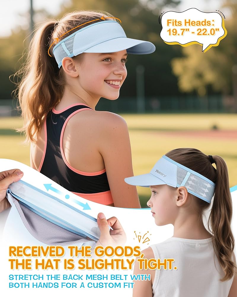 【Adaptive Mesh Headband】The sports Visor Hat hat features an elastic stretch design that conforms to head contours, eliminating tightness or pressure marks—ideal for extended outdoor activities. Its universal fit accommodates various head shapes while adapting to children's rapid growth, reducing the need for frequent replacements. With an adjustable range of 19.7" - 22.0" (50-56 cm), it's perfect for kids aged 6-14