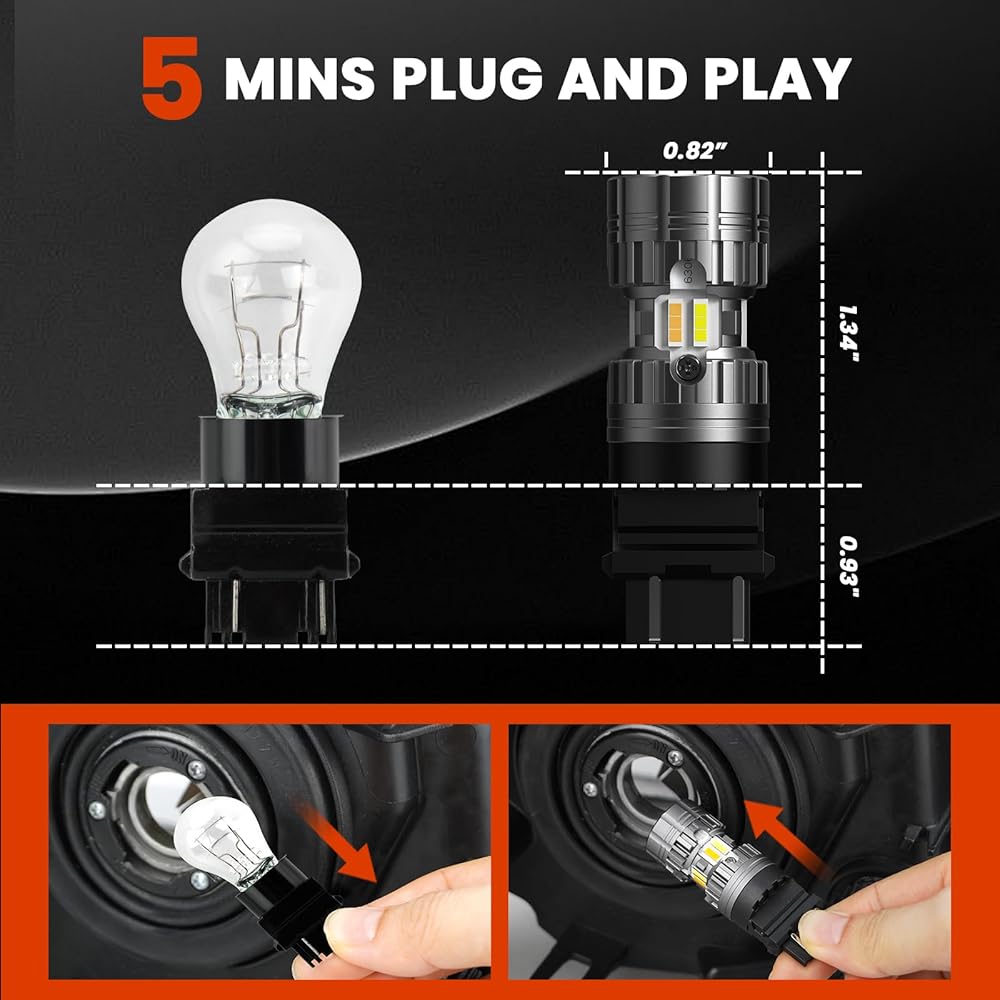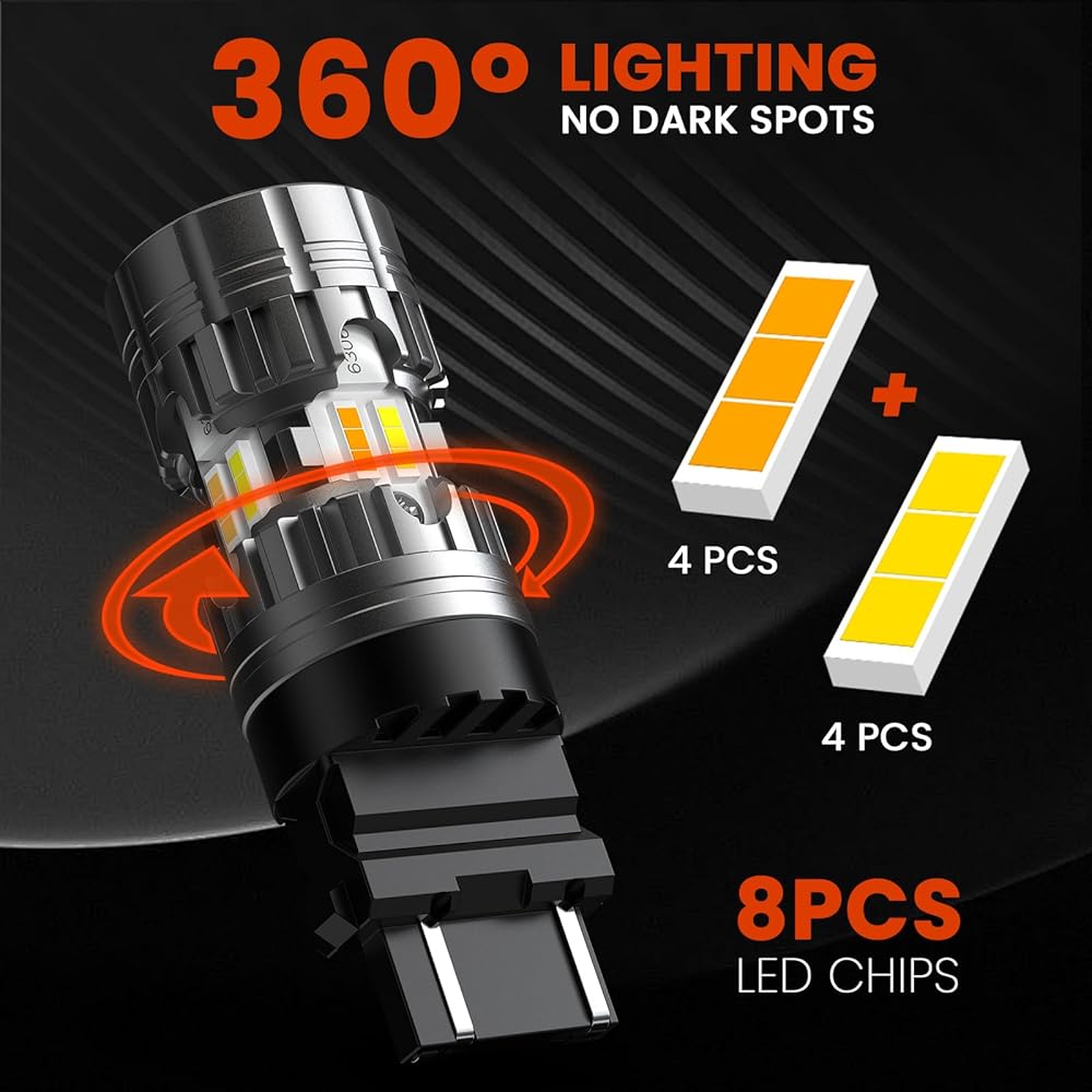 500% Brighter than Halogen: YCLL 3157 LED bulb switchback is built with newest high brightness LED chips, generating 3000LM super bright output per pair, which can help others notice your vehicle faster and clearer even in the bad weather.