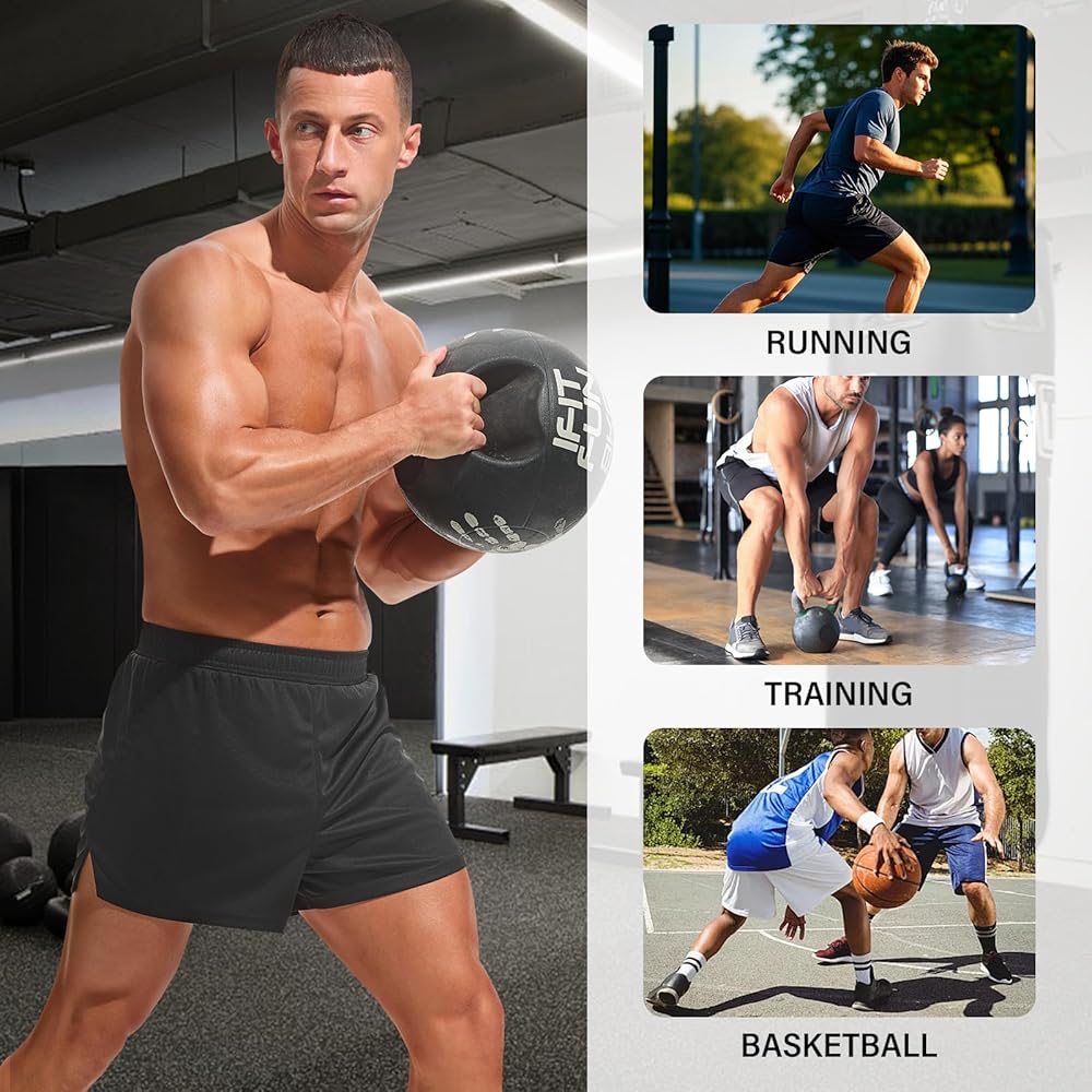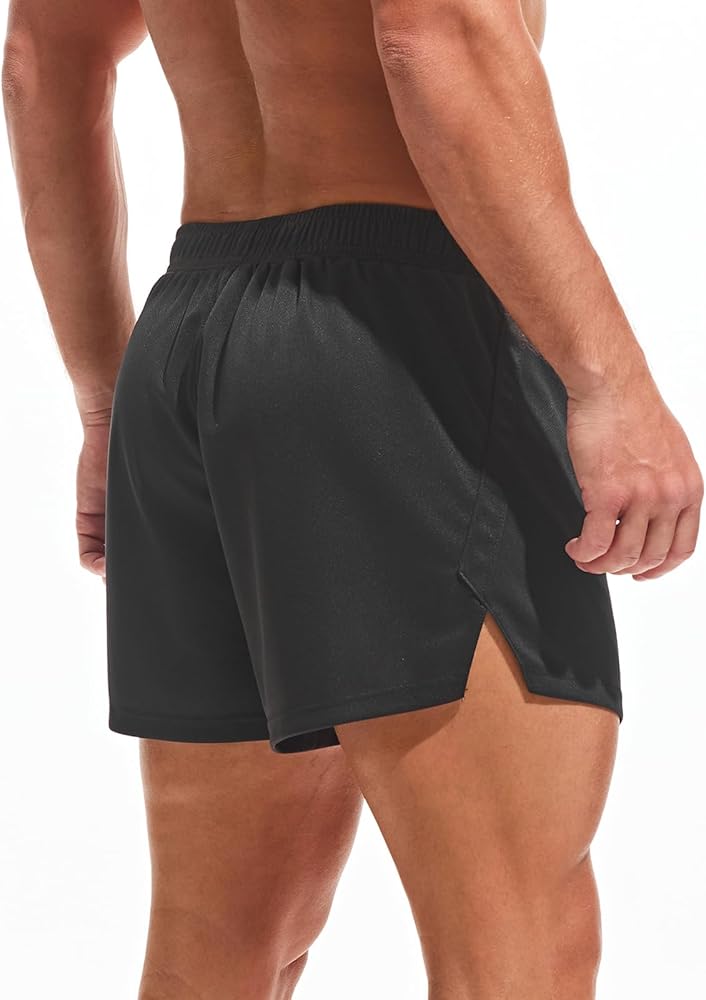 Mens athletic shorts are made of 100% polyester. Lightweight mesh fabric for easy ventilation and dissipation to keep you cool during workout. Soft and skin-friendly, provide a comfort wearing experience