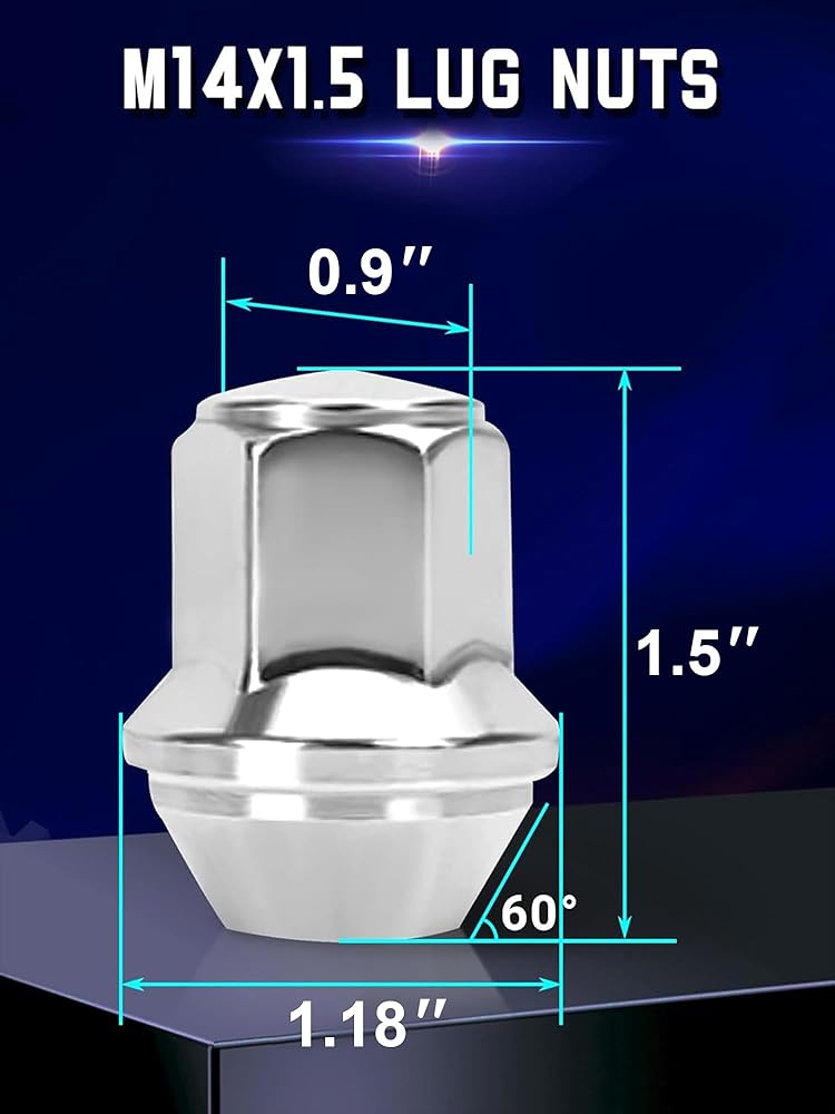 Specifications: 14x1.5 Thread Pitch; 7/8'' (22mm) Hex; 1.46" (37mm) OAL; 60-Deg Acorn Seat; Closed End; Color: Chrome