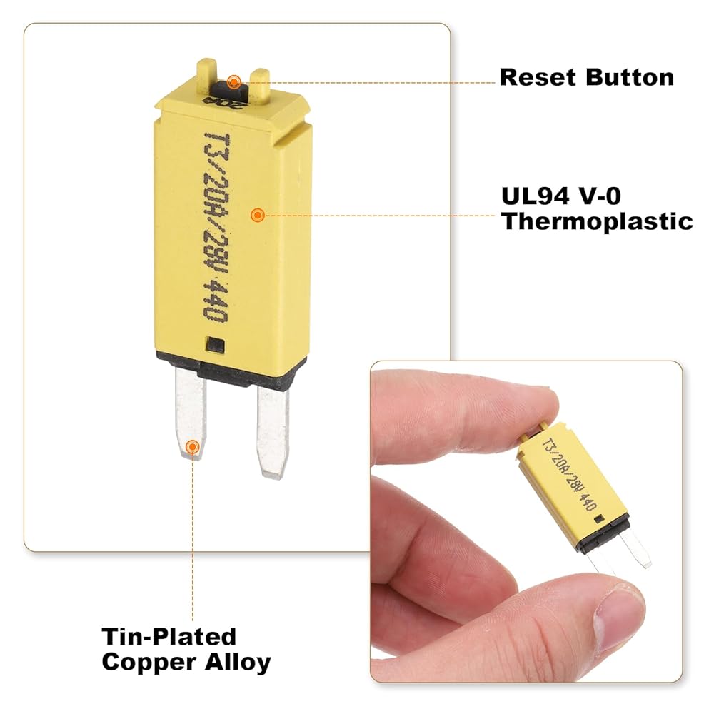 Material:UL94 V-0 Thermoplastic, Tin-Plated Copper Alloy; Overall Dimensions: 29 x 12.5 x 6mm / 1.14 x 0.5 x 0.24 inch(LxWxT); Pin Length and Pin Pitch: 9 x 8mm / 0.35 x 0.32 inch; Reset Mode: Manual; Voltage: 28V DC; Current: 20A; Color: Yellow; 3 Pack of Mini Fuse Circuit Breaker