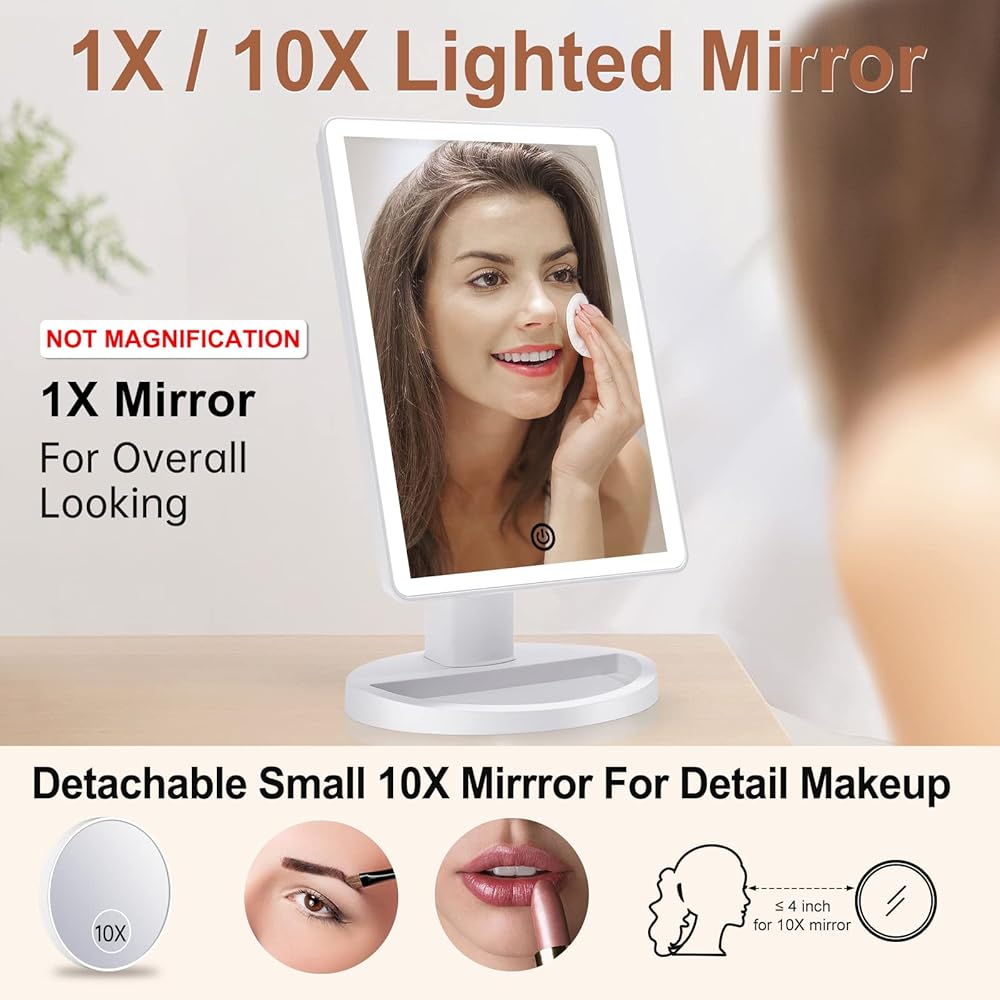 【1X/10X Magnification Mirror】The lighted mirror is 1X normal mirror which you can take an overall look of your facial makeup. The detachable 10X magnification round mirror helps you to see every detail clearly and apply delicate makeup such as mascara, eyeliner, eyebrow and lipstick. 2 suction cups can mounted mirror on glass or big mirror.