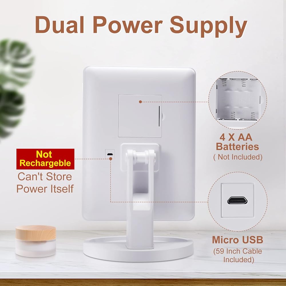 【Double Power Supply】 The LED makeup mirror is powered by 4 AA batteries (not included) or USB cable (including). The mirror itself cannot store power.