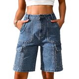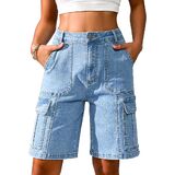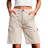 Long shorts for women: featuring 6 functional pockets (including cargo pockets), 9-inch inseam, high-rise waist, and zipper fly with button closure. Combines utility design with tailored comfort.