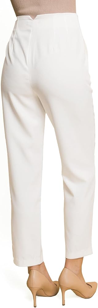 High rise, dress pants with a classic-fit that tapers down the ankle. Classic zipper and button front closure with pin-tuck seams around the waist create a flattering silhouette. Pockets on the front only.