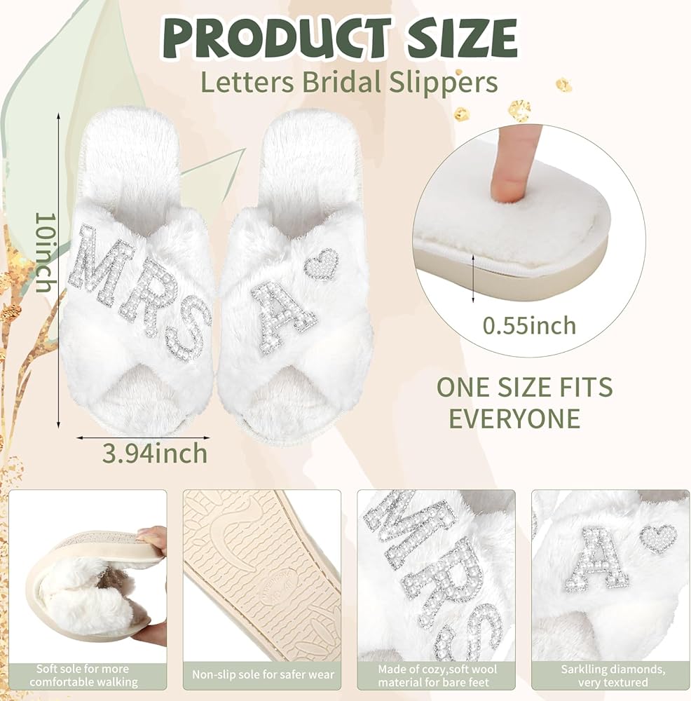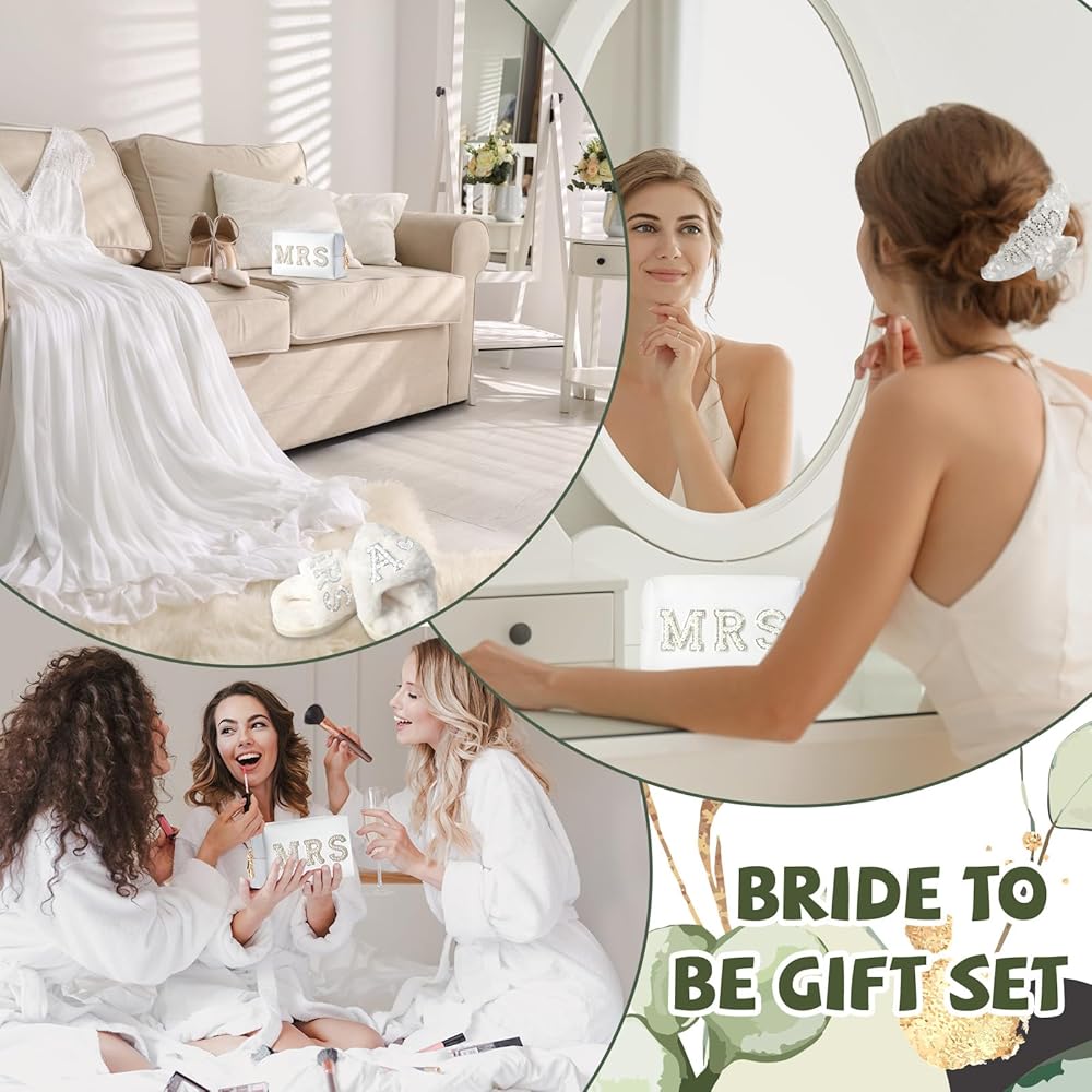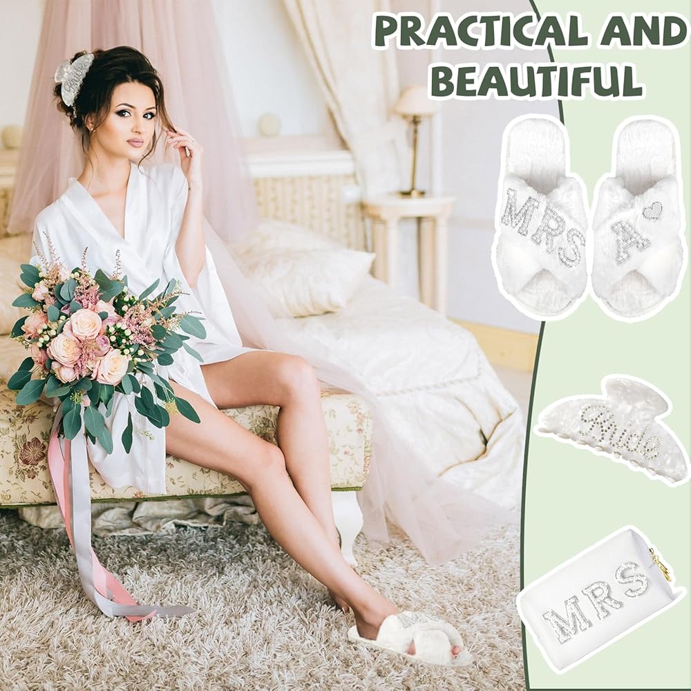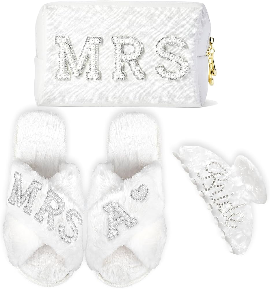 Our bride to be gift set Includes a white PU leather bride cosmetic bag with rhinestone pearl MRS letters, a rhinestone Bride letters hair clip, white bride slippers with rhinestone pearl “MRS” and “G” letters, which can nicely meet your wedding use.
