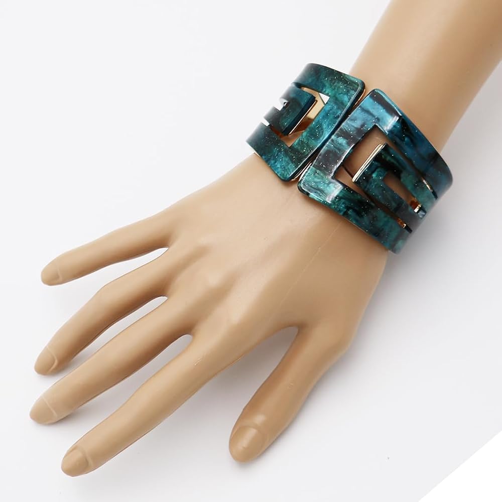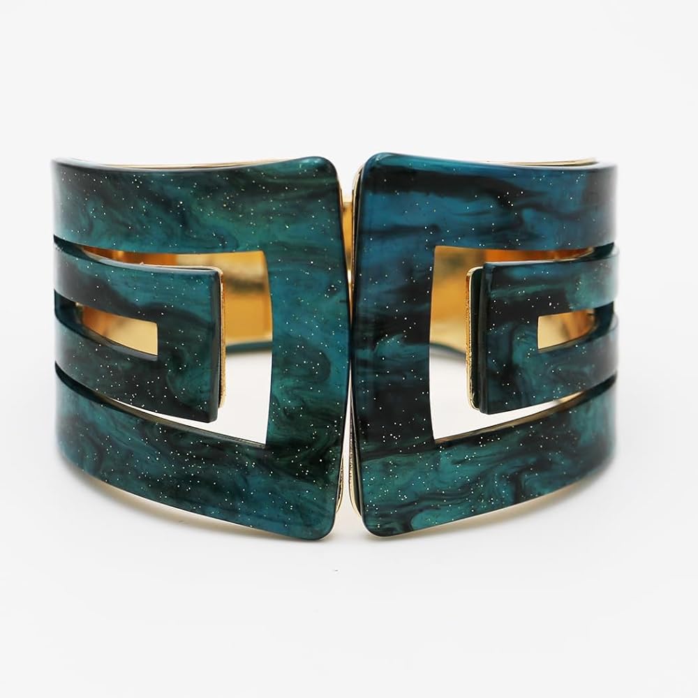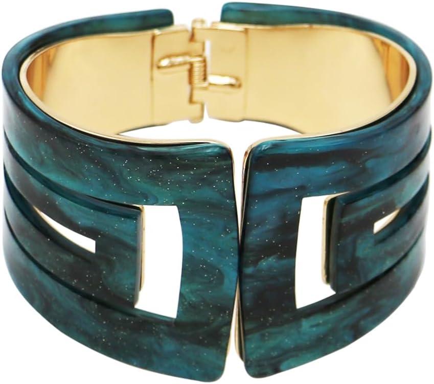 This is a large statement jewelry piece that's sure to give your outfit some added pizzazz! Cuff style bracelet is both classic and timeless. Colorful Lucite bracelets have a marbled pattern with sparkling glitter flecks or a wild leopard print pattern to choose from. All style have a gold tone inner frame and hinged hardware.