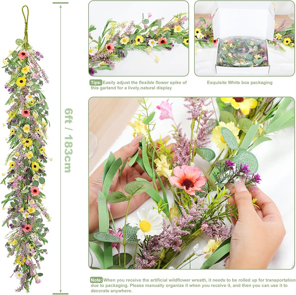 𝐁𝐄𝐀𝐔𝐓𝐈𝐅𝐔𝐋 𝐃𝐎𝐒𝐄: You will receive 1 6-foot artificial wildflower wreath, each lavender wreath is carefully handmade, the purple wreath is tightly packaged in a white box, so please carefully arrange the paper strips of the purple wreath and adjust them outward for optimal use before use for a full, beautiful look, decorate with the vibrancy of spring with our charming spring wreaths!