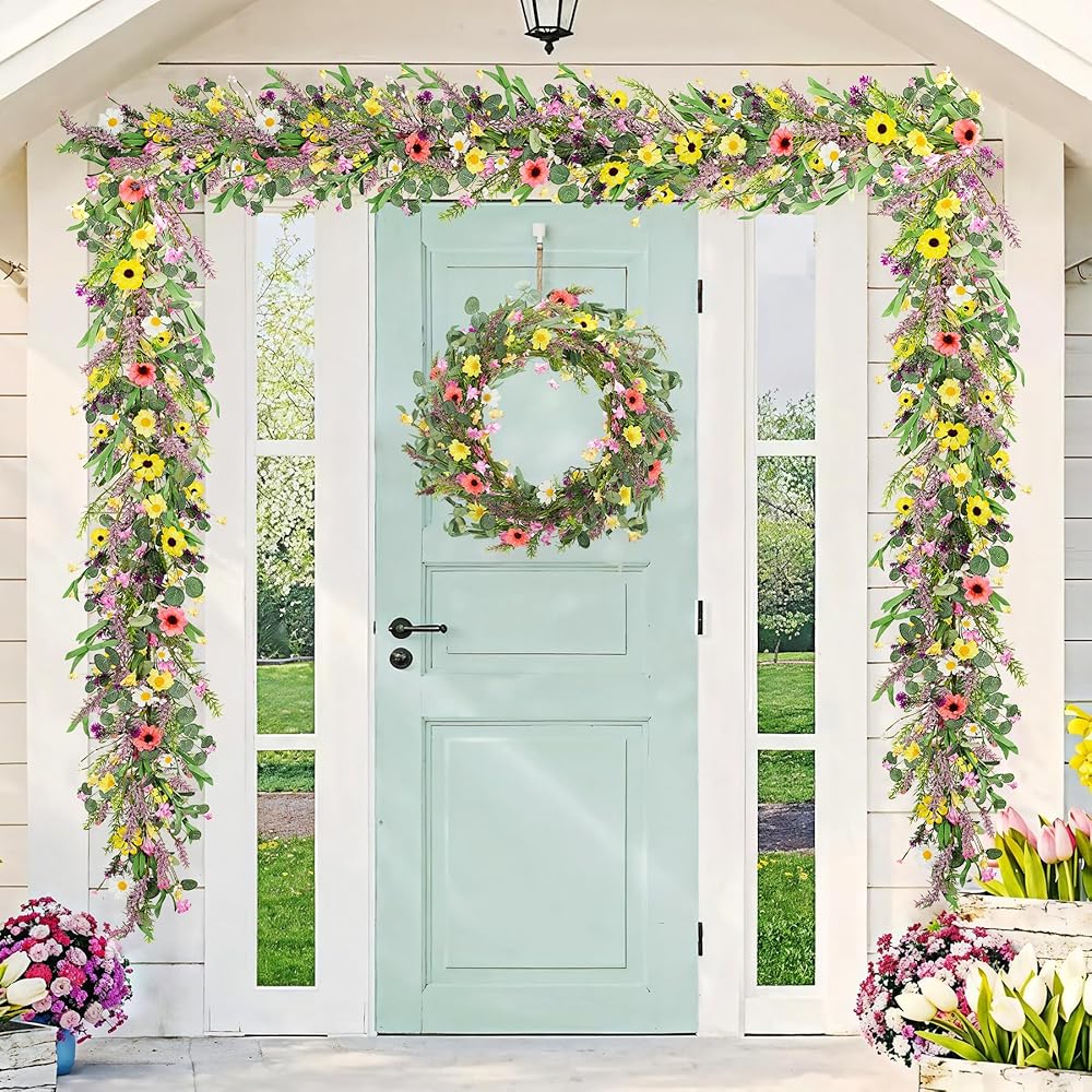 𝐏𝐑𝐄𝐌𝐈𝐔𝐌 𝐐𝐔𝐀𝐋𝐈𝐓𝐘: This spring wreath is made from advantageous plastic molding and filled with daisies, lavender, and brightly colored flowers, blooming with realistic lavender flowers on sturdy vines to ensure durability and beauty, winding through your space to create luxurious and complete decor becomes easier!