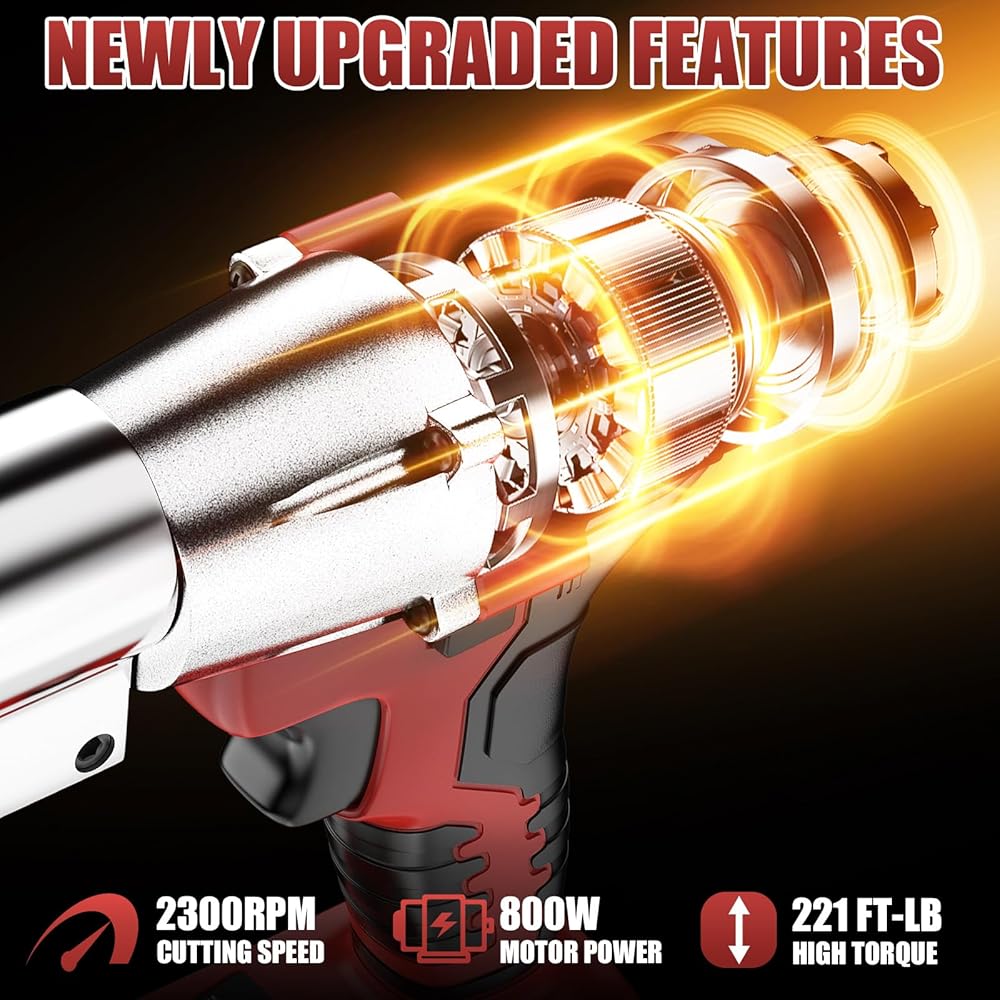 2300RPM Max Brushless Motor & Safety Lock: The electric metal cutter equipped with a MAX 2300RPM brushless motor, providing up to 800w of high-efficiency power. This cordless metal cutter sheet designed with a safety lock button, forward and reverse buttons back to center can lock the tool to avoid injury