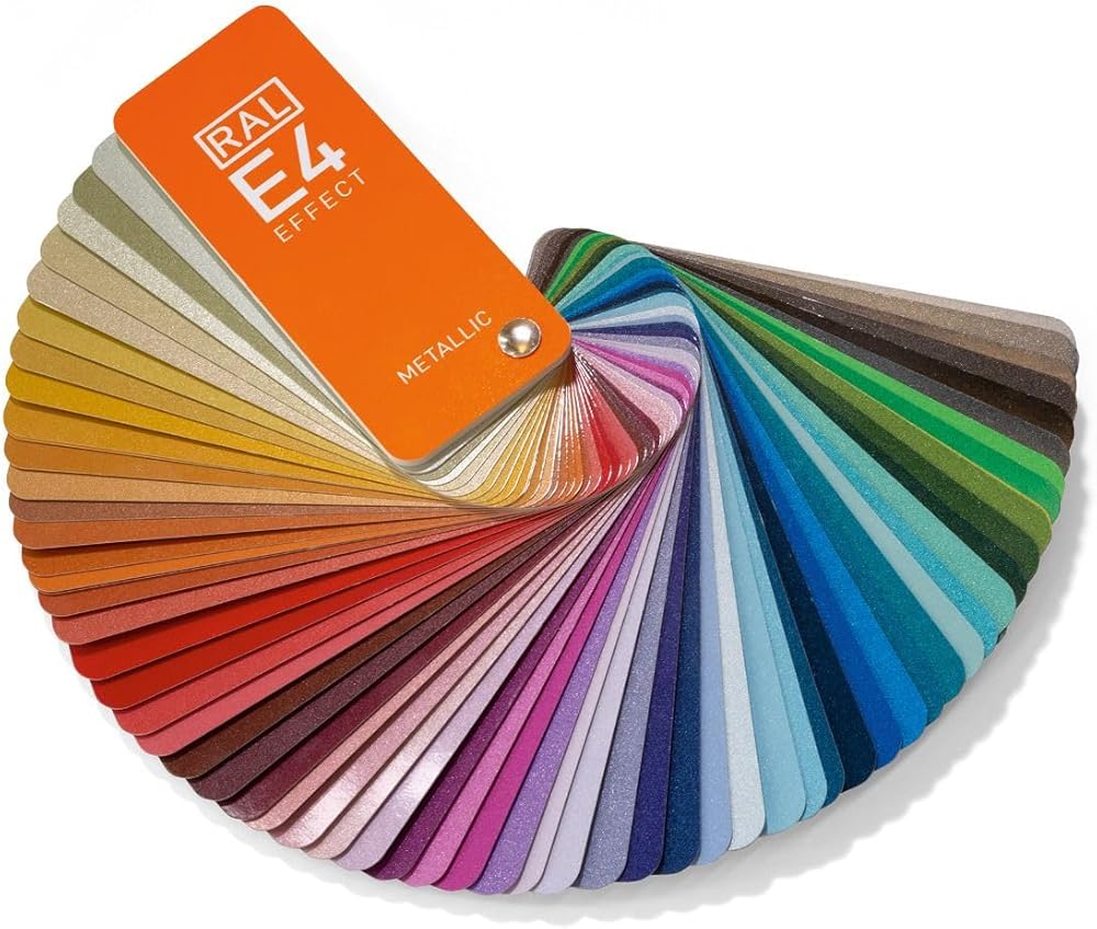 - RAL EFFECT E4 color chart features 70 metallic colors on large-sized, full-surface swatches, formulated in the color circle