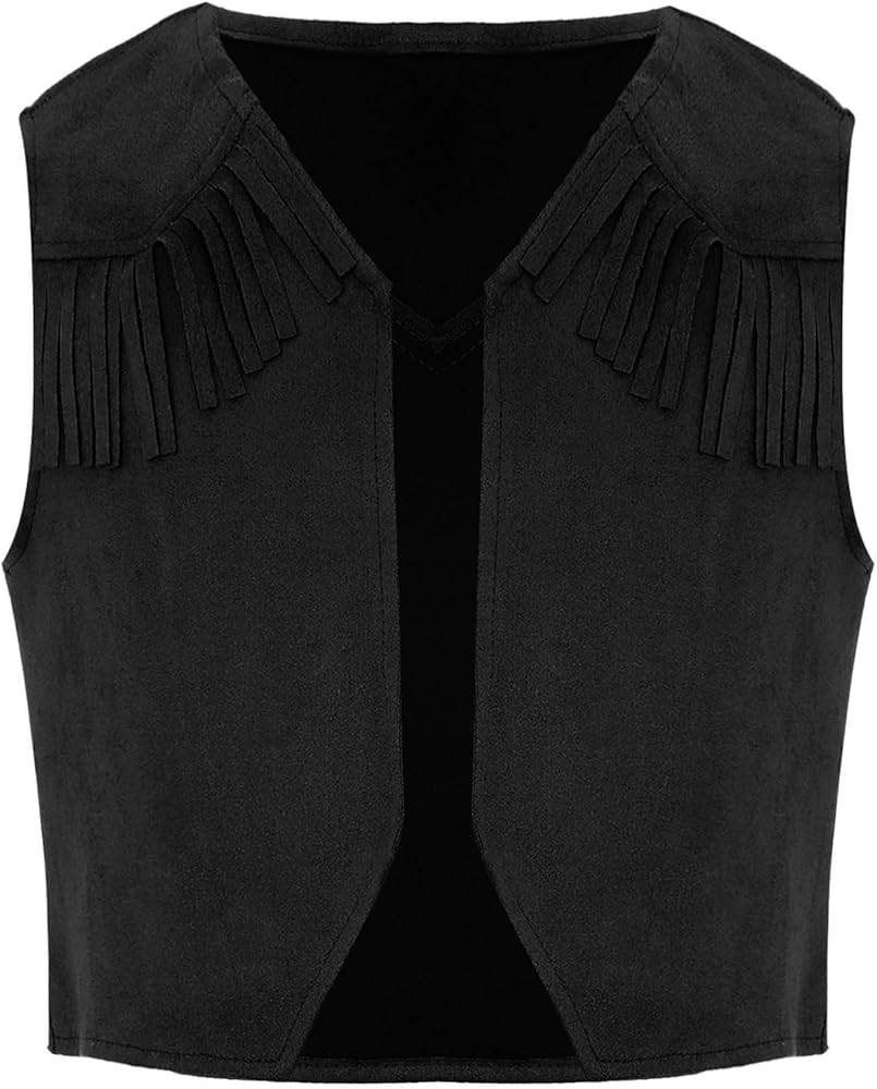 Solid color vest with open front and no lined, pointed hem, and adorned with fringe at chest