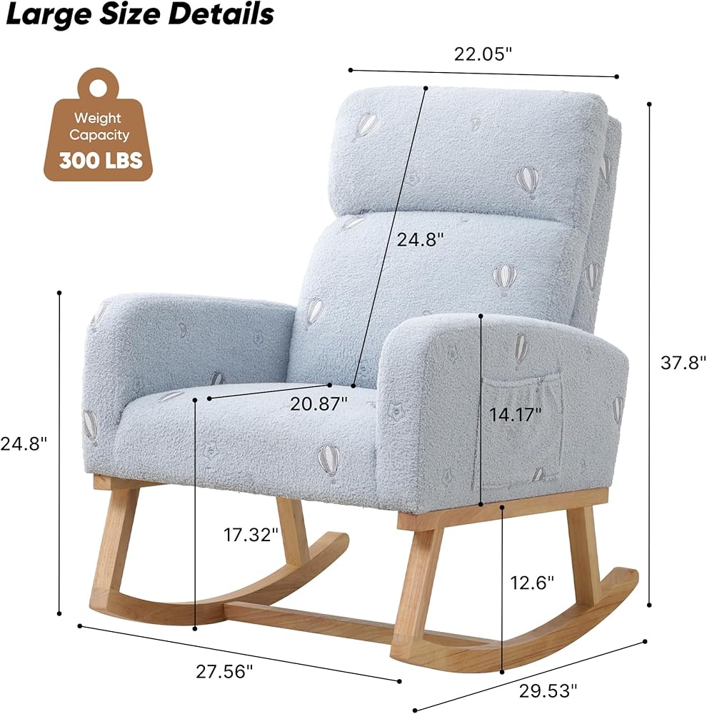 【Nursery Rocking Chair】Product Size:27.56"D×29.53"W×37.8"H,The rocking chair frame is made of solid wood and a thickened rubber wood base,Super sturdy,with a weight capacity of up to 300LBS,The non-slip pad at the end of the wooden legs can not only bring a soothing effect,but avoid scratching the floor.