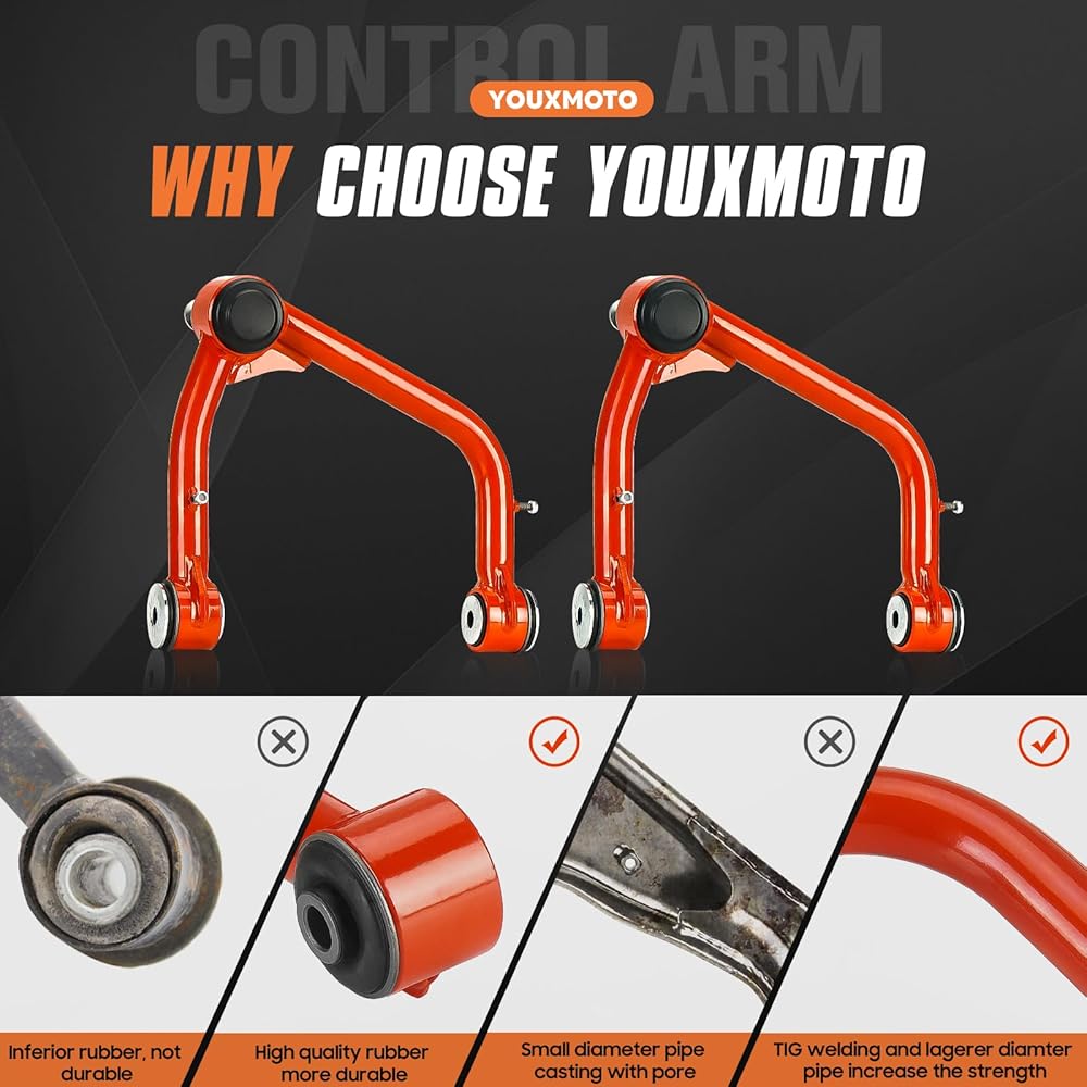【Material】The front upper control arm is made of high-strength steel with solid mounting bracket. Unparalleled strength and durability, no welding weakness.