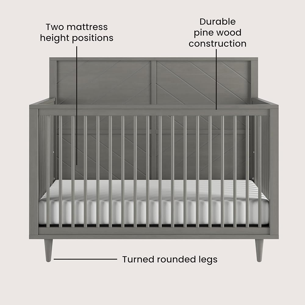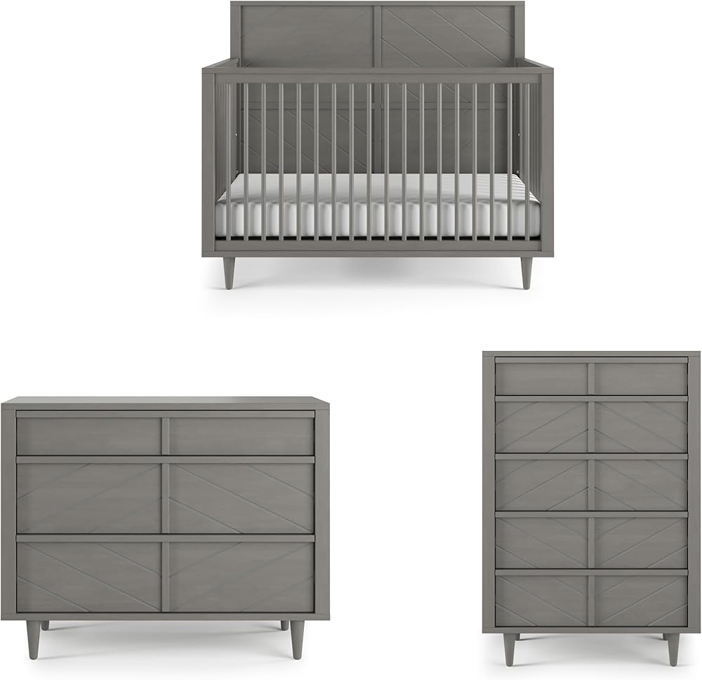 The Child Craft Surrey Hill 3-Piece Nursery Set features the Surrey Hill 4-in-1 Convertible Crib, the Surrey Hill Dresser, and the Surrey Hill Chest. Each piece is crafted from strong, sturdy pine wood and wood veneer.