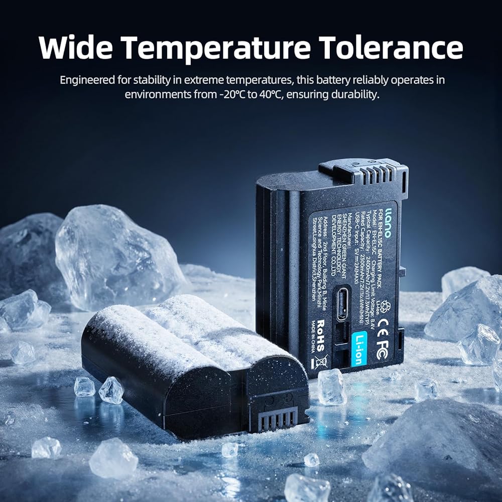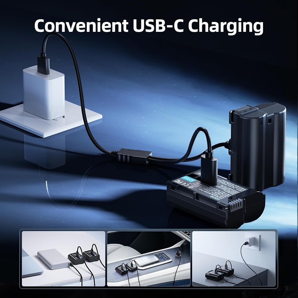 2-Pack EN-EL15C Battery for Nikon: Elevate your photography with the llano en el15c battery designed specifically for Nikon Z6III, Z8, D850, Zf, D7500, Z6II, Z7II, D750, Z6, Z7, Z5, D7200, D7100, D800, D620, D610, D600, D810, D850, D800E, D810A, P520, P530, D500. This fully decoded enel15c battery delivers seamless compatibility with your camera system -no annoying warning pop-up (Compatibility Note: The EN-EL15C battery is fully backward compatible with EN-EL15a and EN-EL15b batteries)