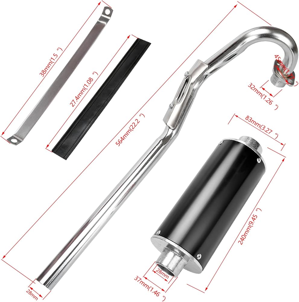【Package Contents:】 1 x Exhaust Muffler, 1 x Exhaust head pipe, 1 x metal clip, 1 x Black rubber gasket, 2 x gasket, 1 x Screw kit。