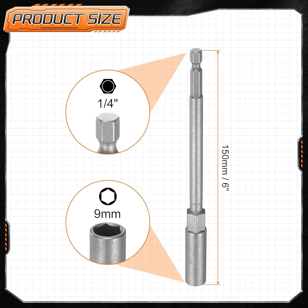 Size - 8mm metric 6-point socket; 1/4" (6.35mm) quick-change hex shank, 150mm / 6" total length. Nut driver drill bit with an extended length design enhances reach in tight spaces, allowing for precise and easy handling of various applications.