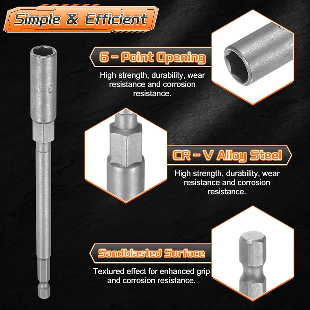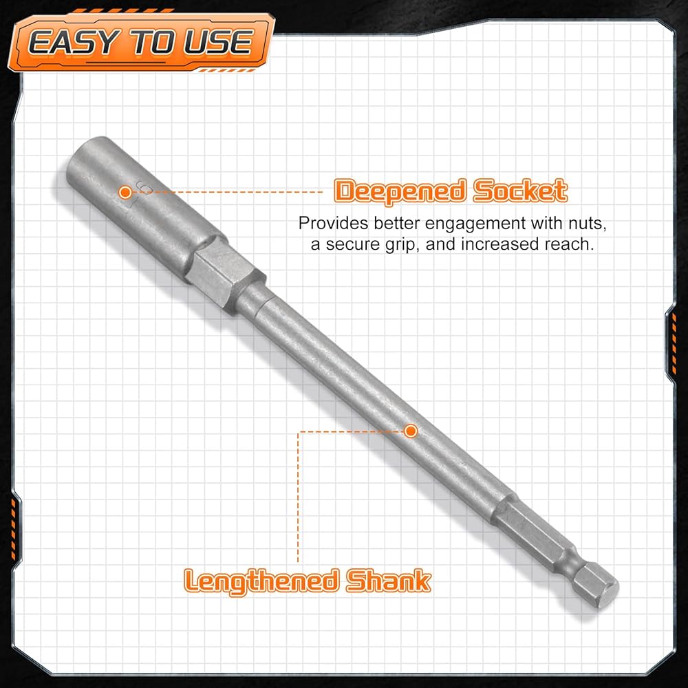 Features - The deepened sleeve enhances gripping force, stability, torque resistance, and wear resistance. Hexagonal design helps achieve a solid grip and effective torque transfer from the tool to the fastener, reducing the effort needed. Additionally, the extended length design of this nut driver drill bit tool provides enhanced reach and access in tight spaces, ensuring it can effectively handle a wide range of applications with precision and ease.