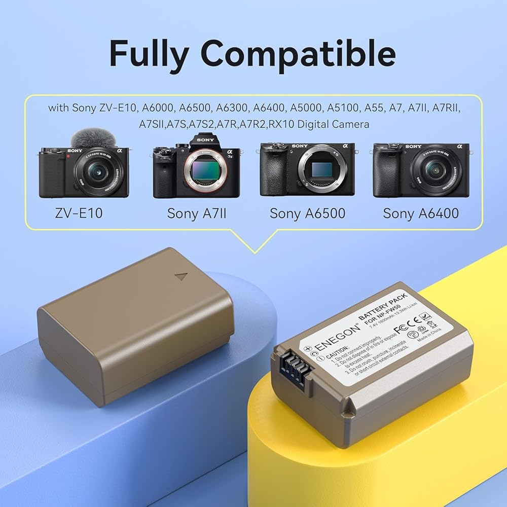 【Perfect compatibility with Sony cameras】The ENEGON NP-FW50 Battery Charger Set is fully compatible with various Sony cameras, including the ZV-E10, A6000, A6500, A6300, A6400, A5000, A5100, A55, A7, A7II, A7RII, A7SII, A7S, A7S2, A7R, A7R2, RX10 and other Sony cameras that use NP-FW50 batteries. It is the ideal choice for professional photographers and photography enthusiasts.