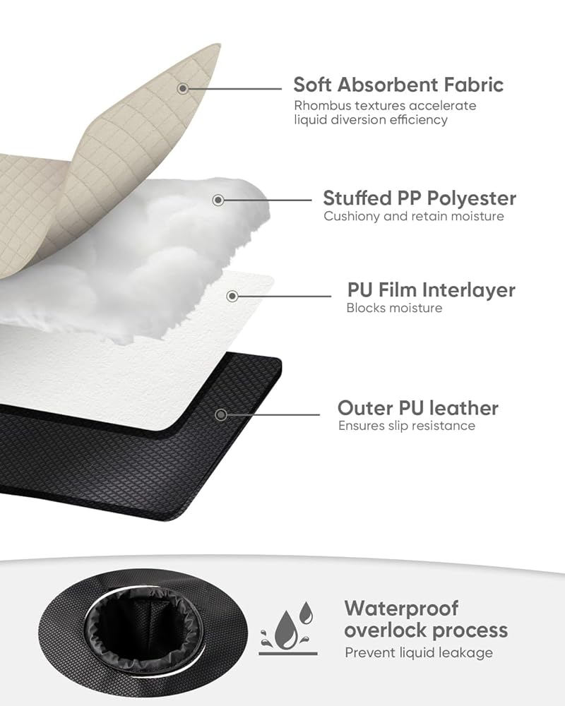 Anti-Slip And Leak-Proof. The car seat liners for potty training built-in 360° buckle hole shield with deep edge and overlock design prevents liquid penetration around harness systems while blocking crumbs/spills. The bottom layer of PU leather with small diamond textures combines anti slip and aesthetics, it keeps the liner firmly anchored without shifting