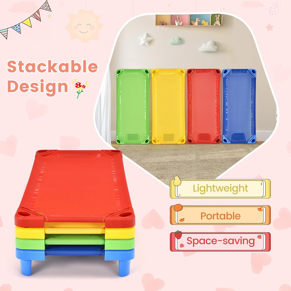 Stackable Daycare Cots for Kid -Pack of 4, Portable Preschool Cots, 52" L x 23" W, Ready-to-Assemble, Space-Saving Toddler Nap Cot for Sleeping, Resting, Naptime, Nursery (4, Multicolor)