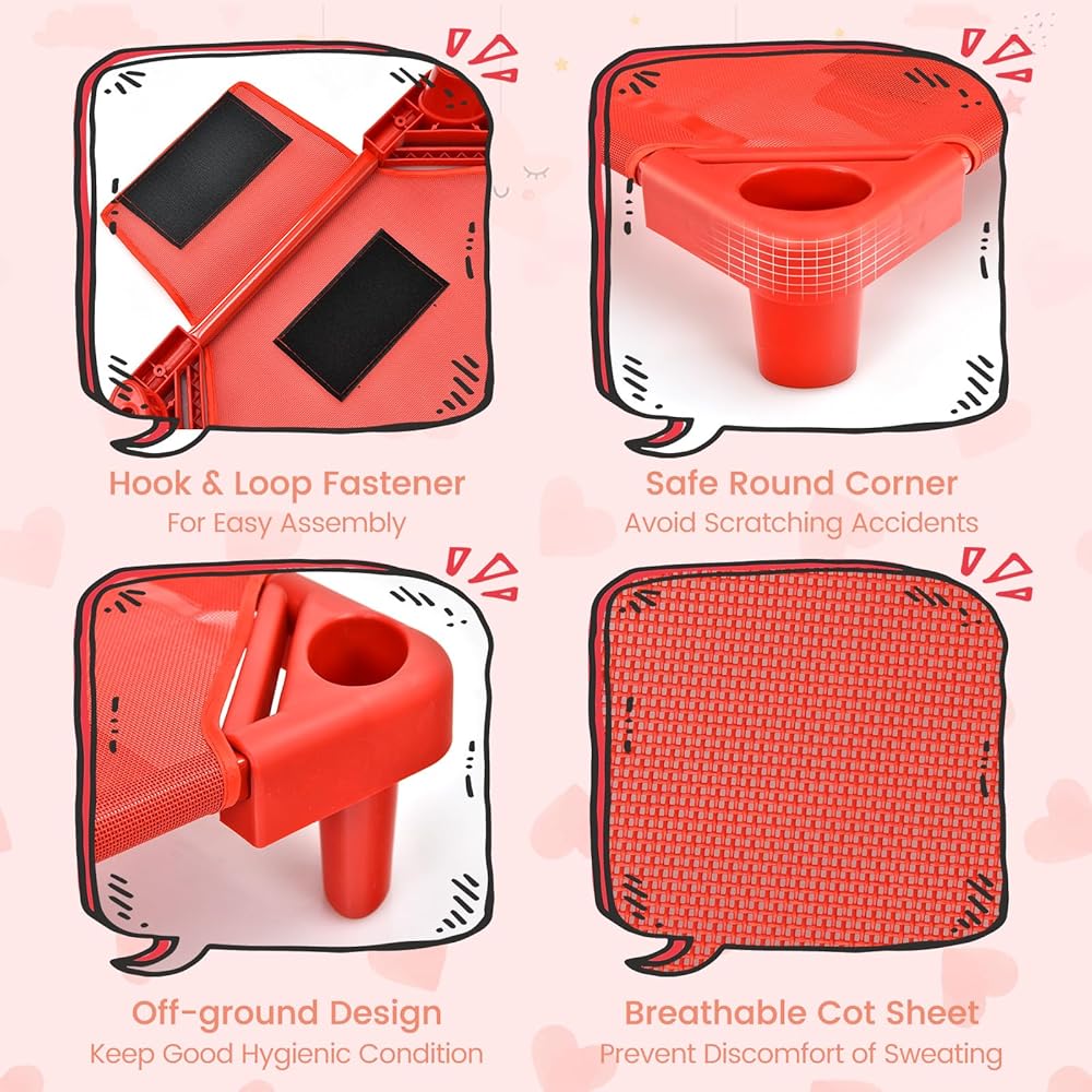 Easy Maintenance: The fabric mesh can be easily cleaned with a damp sponge, and the rust-proof steel frame can be wiped clean. The mesh is removable for deep cleaning, and the toddler nap cots come with instructions and accessories for easy assembly.