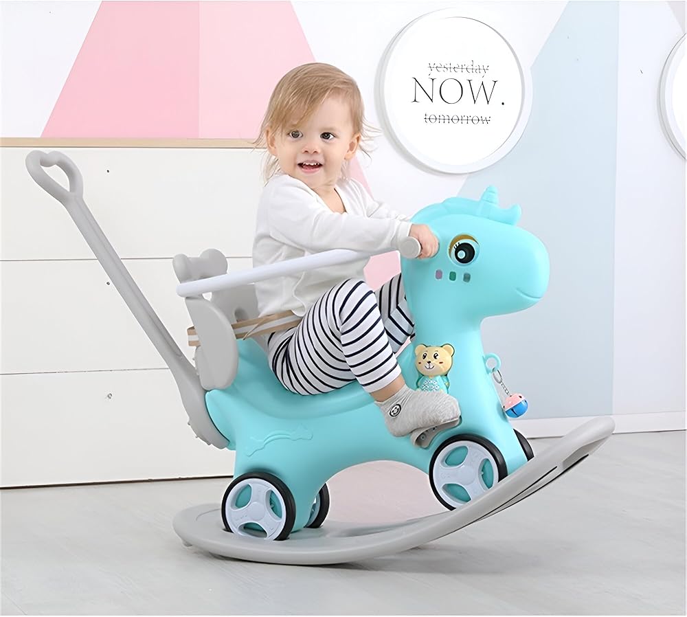🌟【Safe and Comfortable】--There's a 40-degree tilt angle, making it difficult to roll over.Heightened back prevents sweetie from falling backward, while the wheels have axles for a smooth and quiet ride.The entire rocking material is smooth, and solid plastic is circular in the corners to prevent your child from colliding.