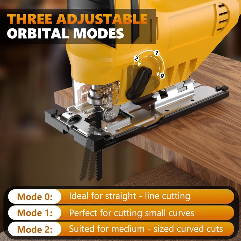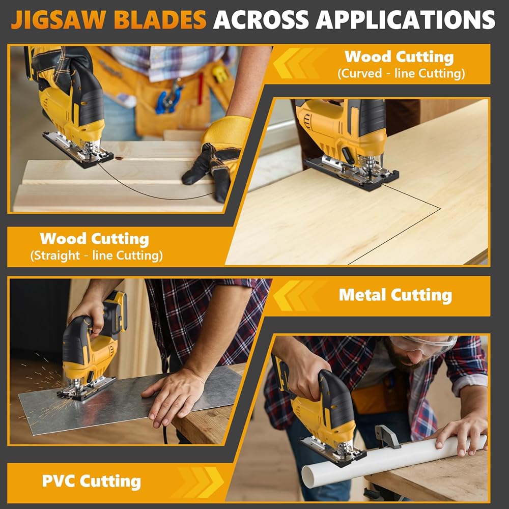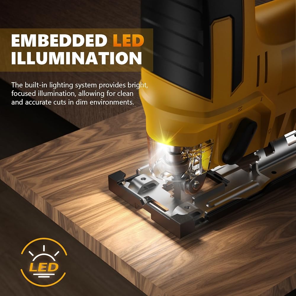 High-Performance Brushless Motor & Variable Speed: Equipped with a brushless motor, the jigsaw tool delivers up to 2900 RPM for efficient cutting, while low-voltage and overload protection ensure durability. Adjustable speed settings (0-3000 SPM) adapt to wood, metal, PVC, and plywood, etc.