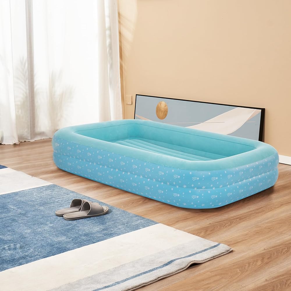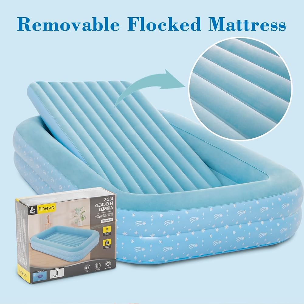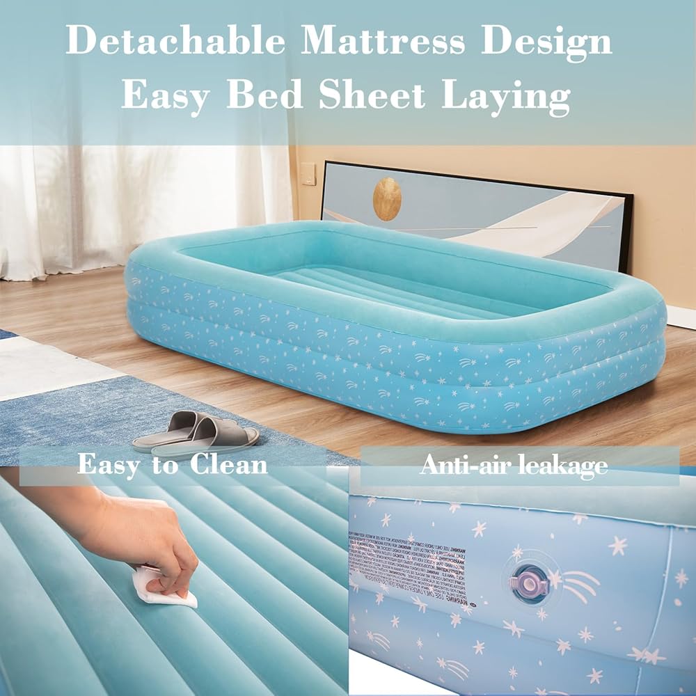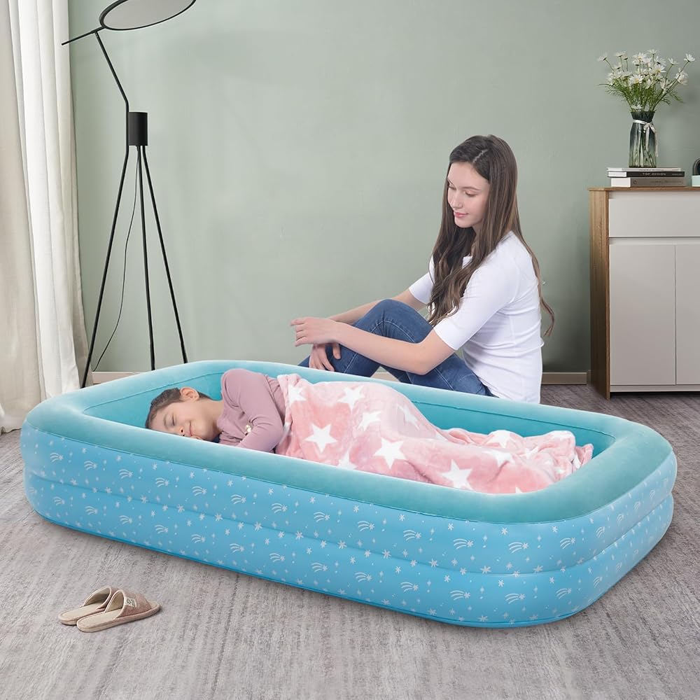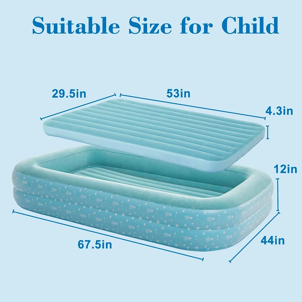 Traveling with kids just got easier with this inflatable air mattress! Perfect for sleepovers, camping trips, or overnight visits with family, this toddler travel bed provides a cozy and secure sleeping space for your little one. The raised sides help prevent falls and rollovers, while the durable vinyl construction ensures long-lasting use. Inflate or deflate in seconds using the included pump, making setup and teardown a breeze.