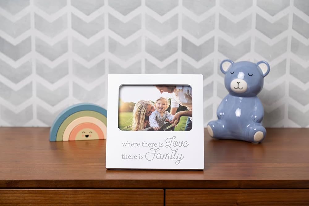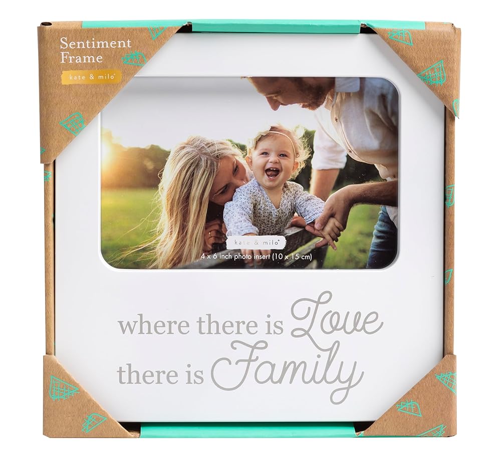Kate & Milo's Our Family Frame celebrates the essence of family in a classic sentiment frame to display in your home. Adorned with the heartfelt message "Where there is love, there is family" this baby keepsake frame is sure to become a treasured photo frame for years to come. This modern white and gray picture frame includes a 4” x 6” photo space and an attached easel for easy tabletop display. Add this baby frame to any shelf, mantel, desk, or table for an everyday reminder of the love and togetherness that define your family's story. The timeless design and profound quote make it a cherished addition to any nursery or home decor. This family keepsake frame makes a great first Mother's Day gift, Christmas gift, birthday gift, baby boy gift, baby girl gift, grandparent gift, grandma gift, baby shower gift idea, or pregnancy gift. Frame Dimensions: 7.25” x 7.25” Photo Insert: 4” x 6”