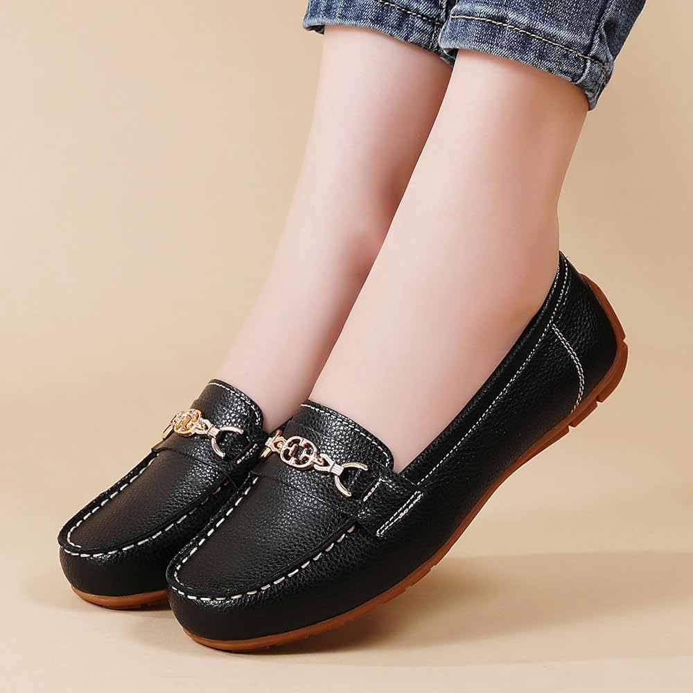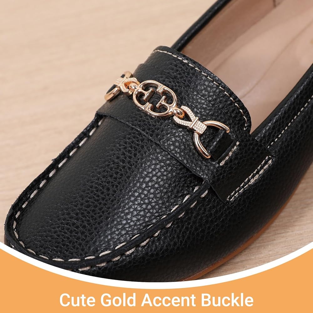 【Signature Metallic Accents】: Elevate your look with gleaming gold-chain buckles – a chic contrast against classic leather. These dressy loafers for women blend professional polish with subtle glamour