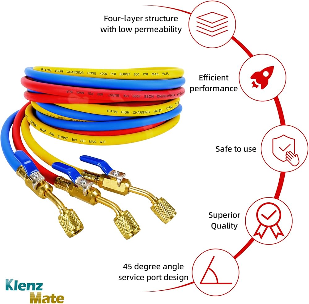 Wide Compatibility. 1/4” HVAC hose adapts to R410a, R134a, R407C, R502, R12, R22 and more. Upgraded refrigerant hose is essential for HVAC, MAC repair, coolant or Freon addition, with its 45-degree angled service port to improve working efficiency