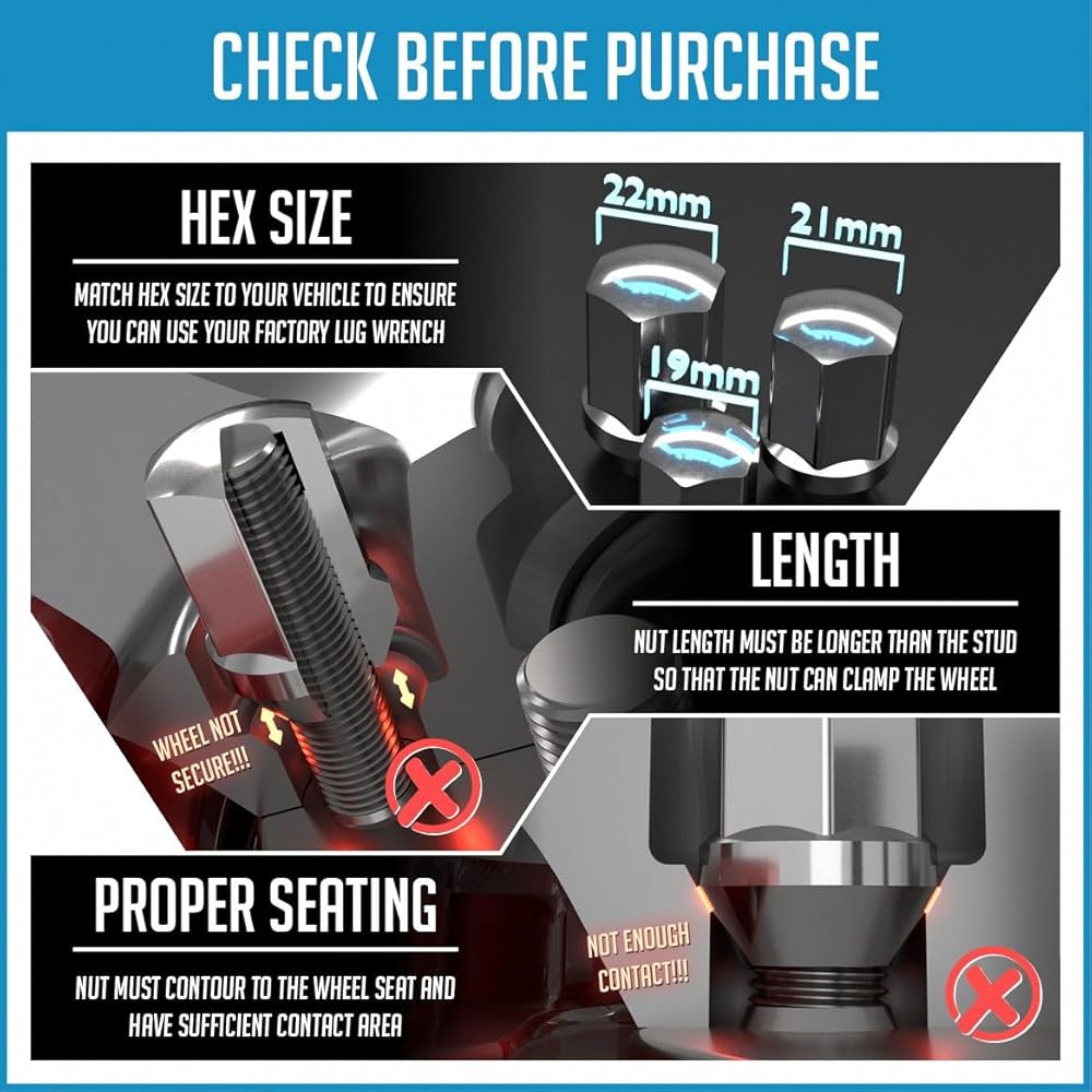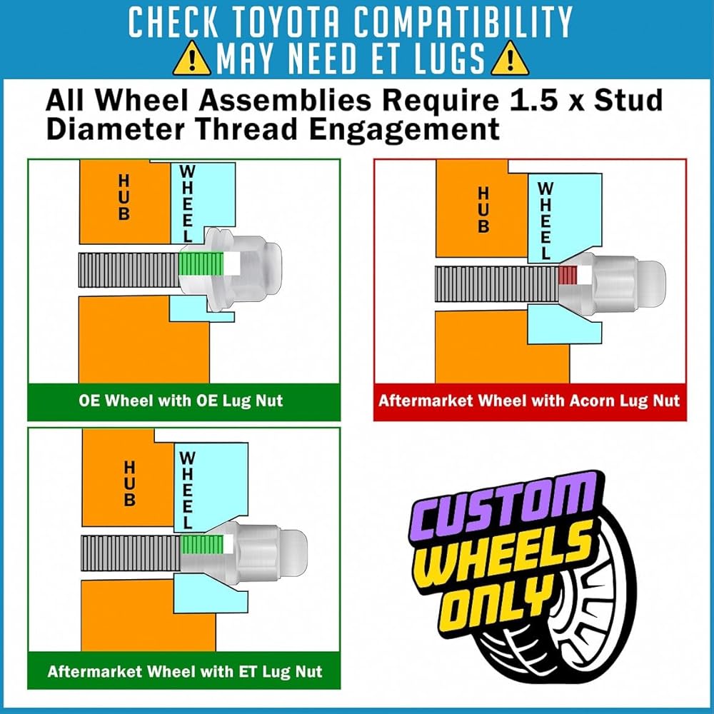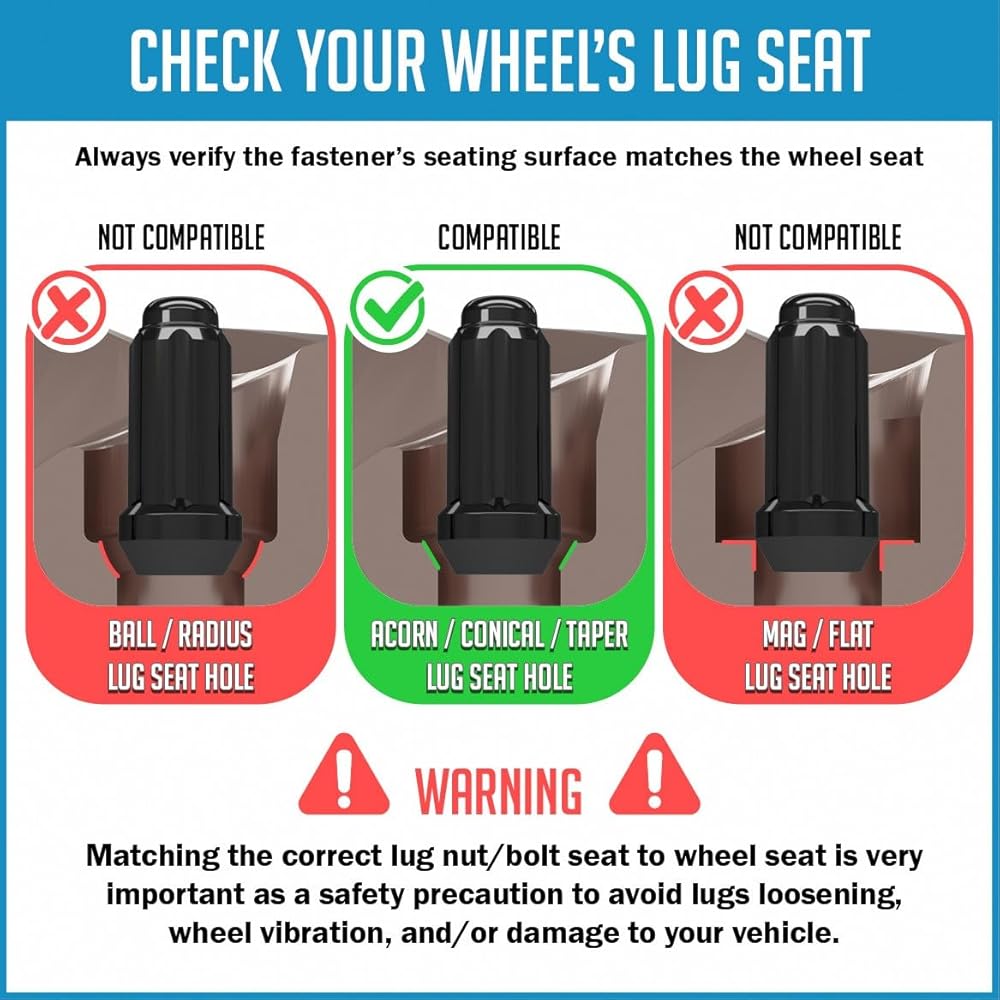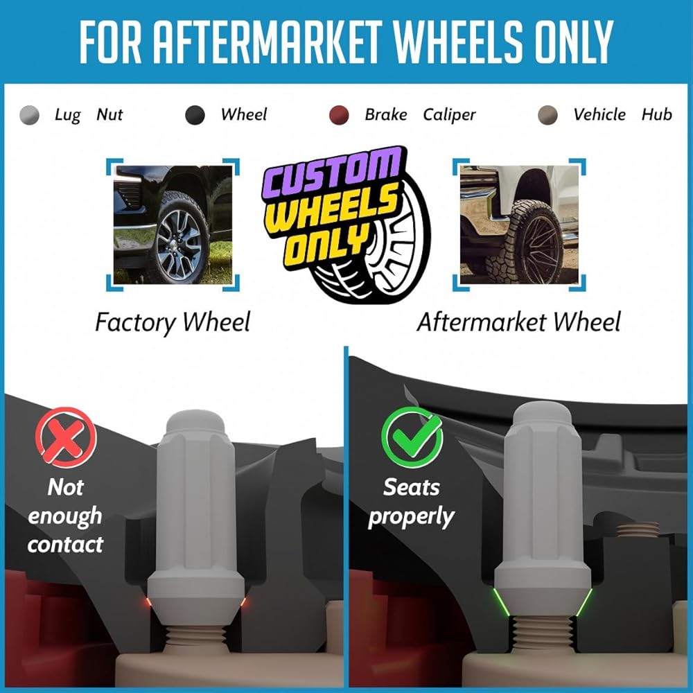 ❌ These Lug nuts are designed for AFTERMARKET wheels only. This lug may be the correct thread for your vehicle in many cases the lug seat is not large enough to create enough claming force to safely clamp the OE wheel to your vehicle.