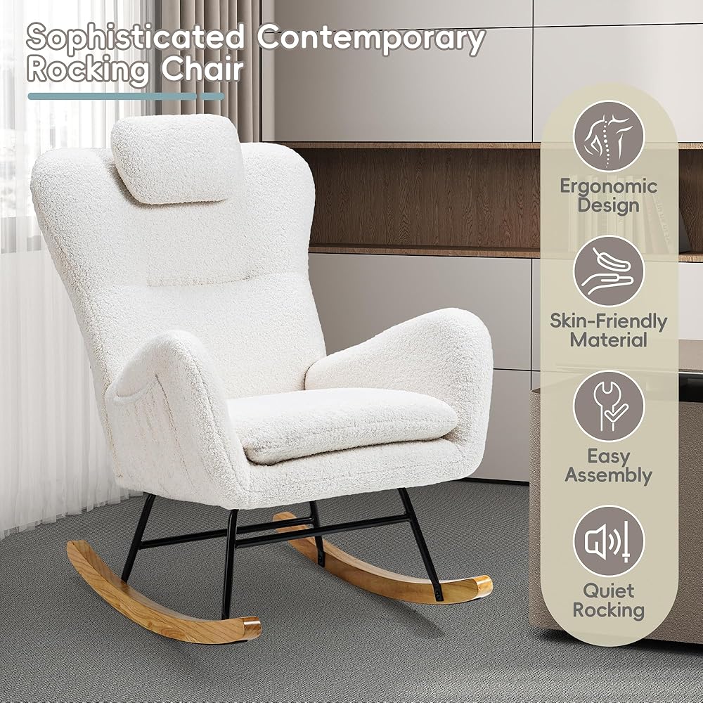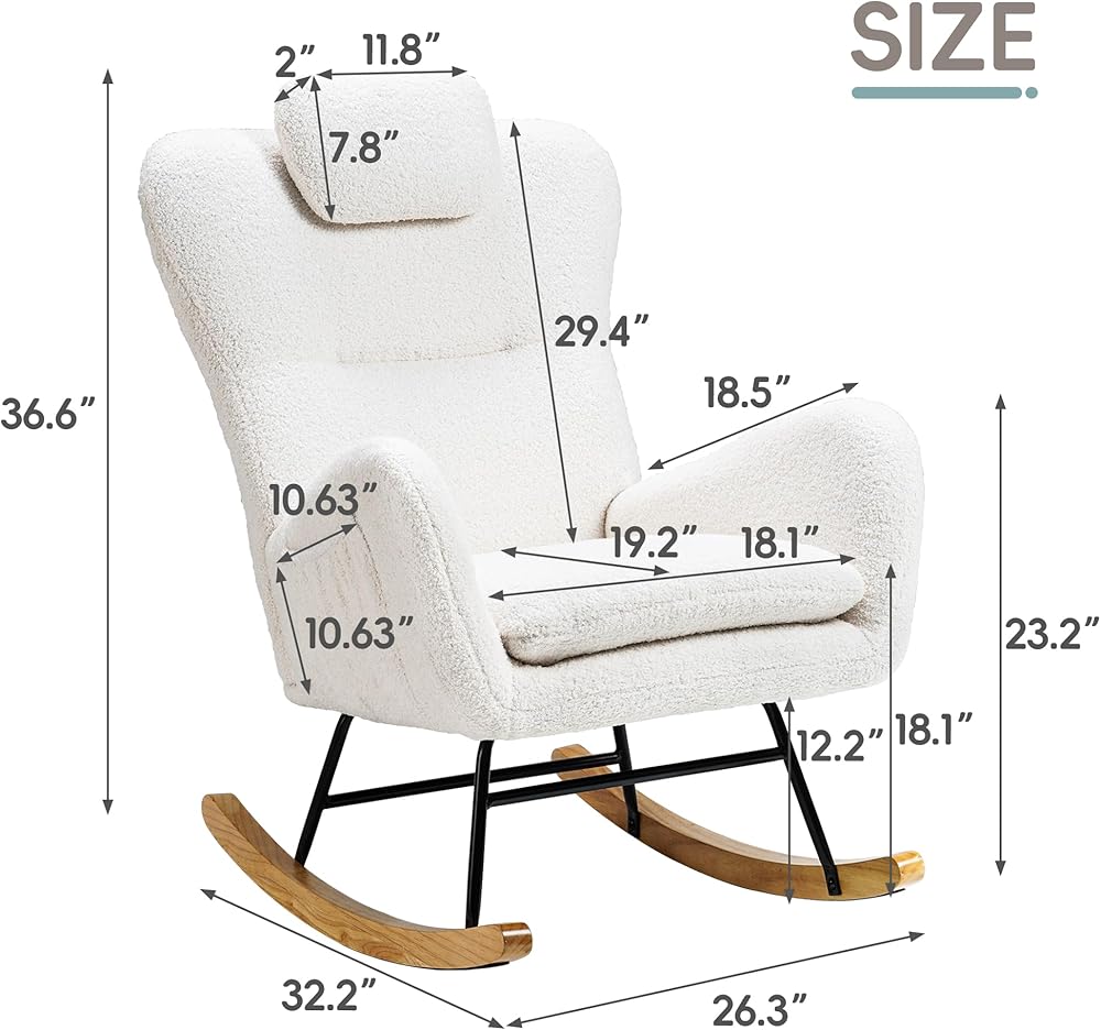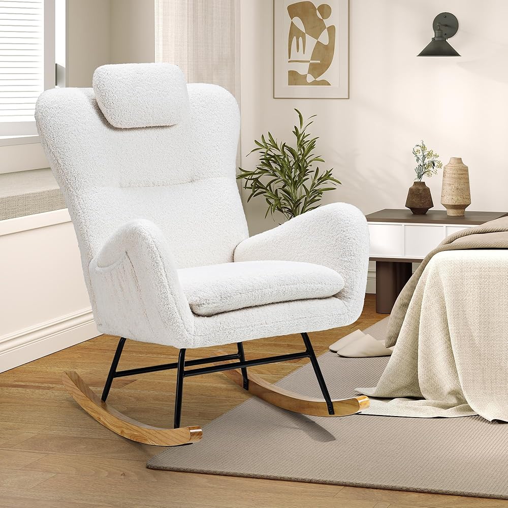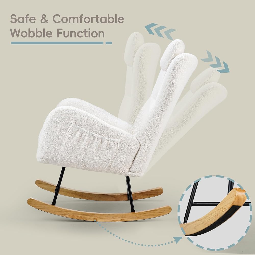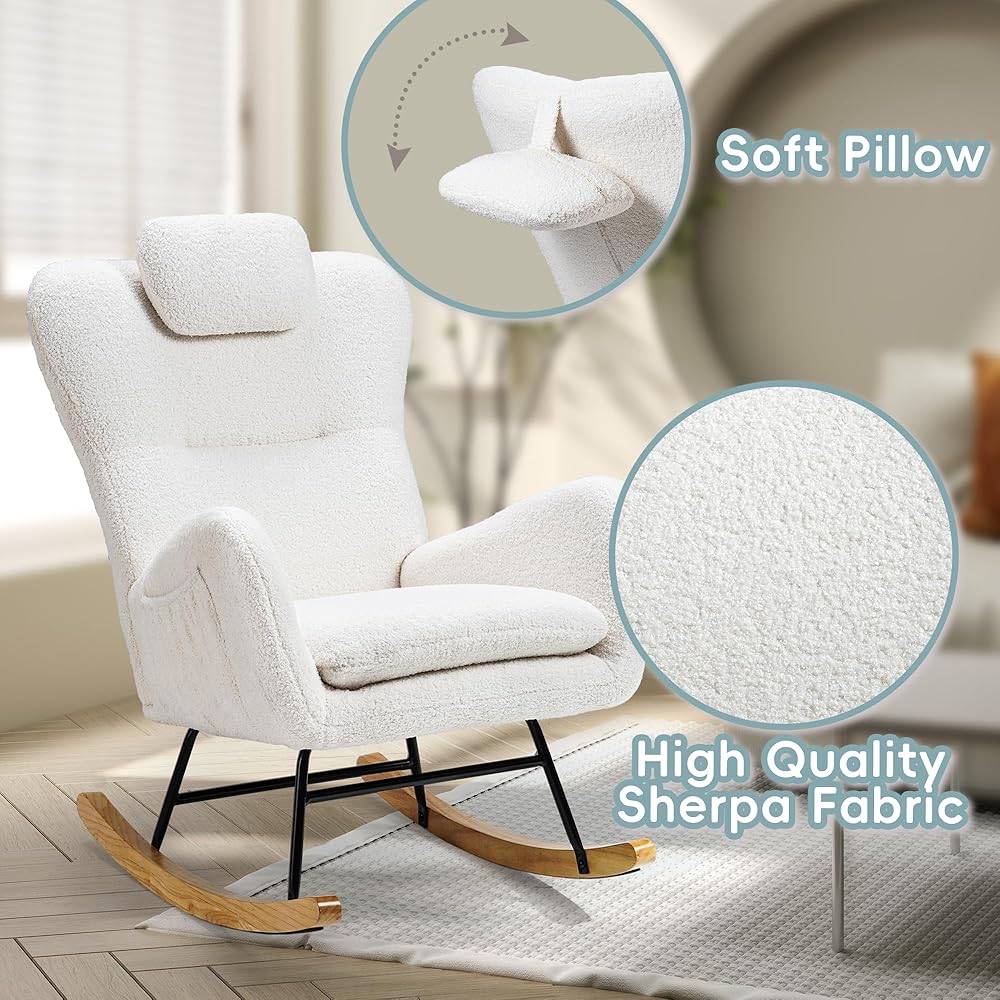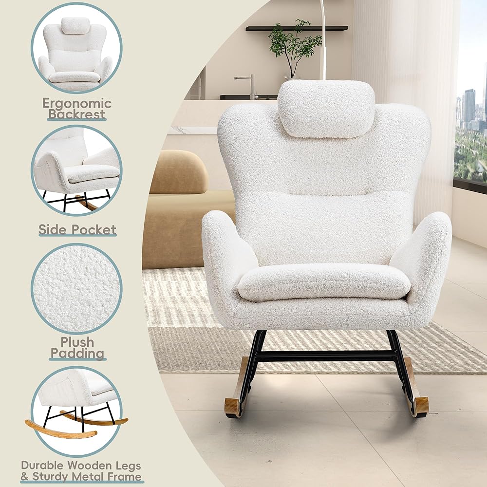 Side Pocket and Headrest Pillow: This teddy padded rocking chair includes a practical side pocket, perfect for keeping magazines or small items within easy reach, adding to your convenience. It also features a soft, plush headrest pillow that provides extra neck support, ensuring a more comfortable and relaxing seating experience for extended periods.