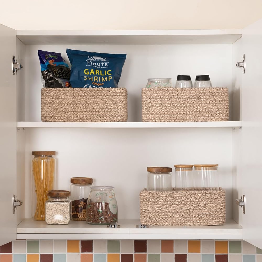 Small Decorative Baskets: The cute small baskets measuring 11.81''Lx7.87''Wx4.72''H, convenient for storing more daily necessities. Each set of 3 pieces can be sorted to store baby diapers, towels, remote controls, keys, credit cards, wallets, charging cables, toys, snacks, paper towels, cosmetics, jewelry, and more