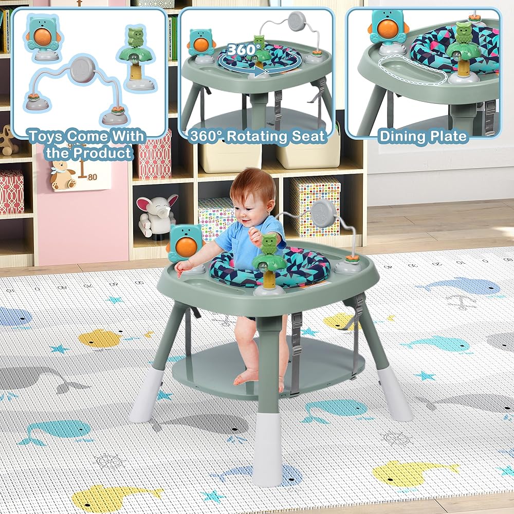MULTIFUNCTIONAL PLAY CENTER: The activity center includes a 360-degree rotating seat and a selection of interactive toys to boost your baby's cognitive and motor skills. The adjustable height settings ensure your baby remains comfortable as they grow, while the flexible tray can be adjusted to suit different activities, from meals to playtime