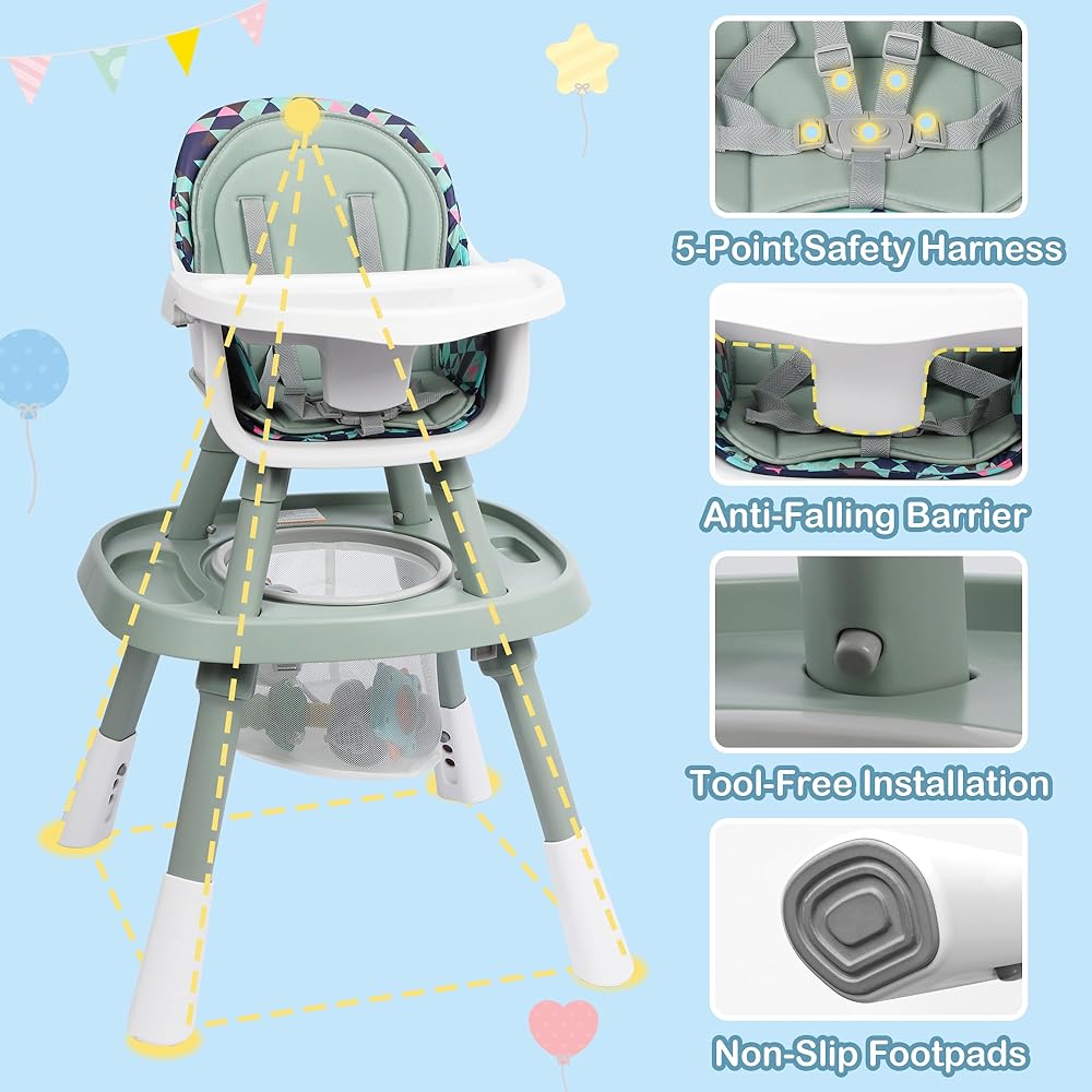 STABLE & SAFE DESIGN: Safety is a priority with the 5-point harness, shoulder pads, and stable pyramid structure. The high chair's height can be adjusted for better stability and to suit various dining surfaces, ensuring your child remains secure. The enlarged non-slip feet provide added balance