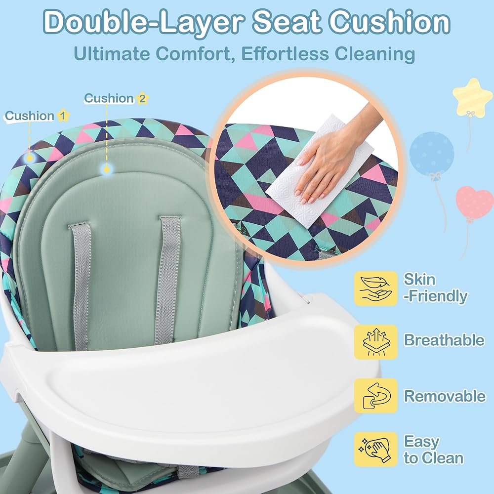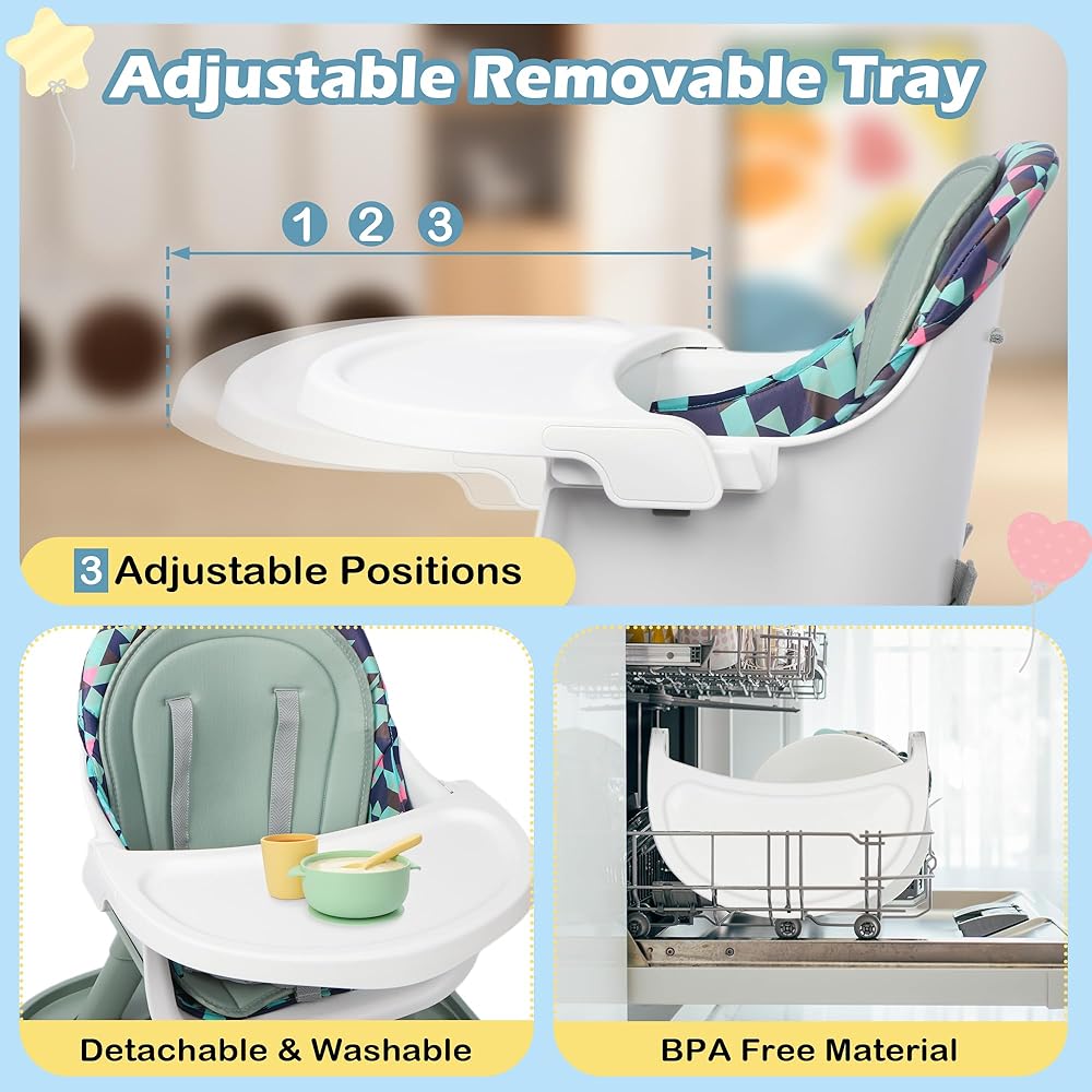 EASY ASSEMBLY & CLEANING: The high chair is designed for quick, tool-free assembly, making setup hassle-free. The adjustable, detachable tray is simple to wipe down and dishwasher-safe, ensuring easy cleanup after mealtime chaos