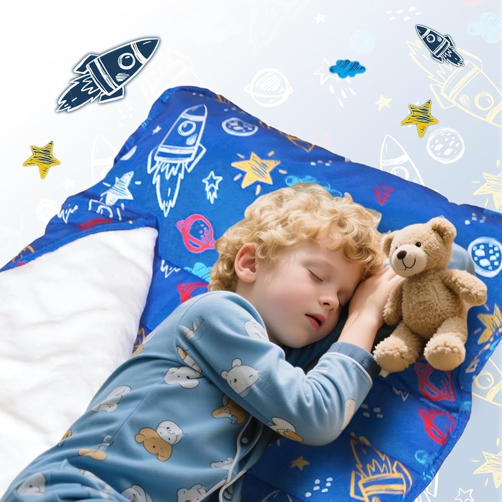 Toddler Nap Mat with Removable Pillow and Blanket, Cot Nap Mats for Daycare Preschool Kindergarten, Roll Up Lightweight Portable Travel Sleeping Bag, Blue Space