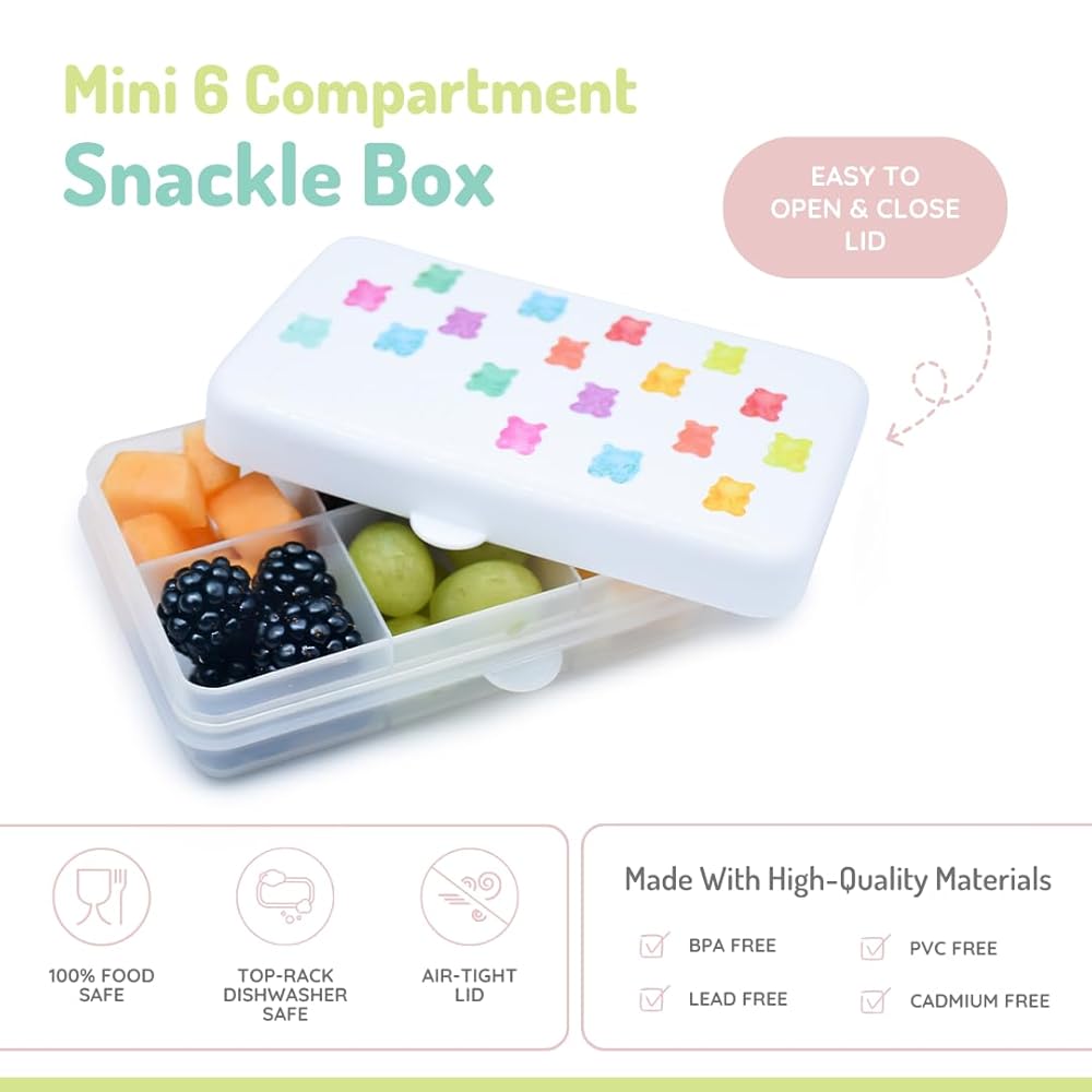 MAKE FEEDING FUN: Our 6-compartment Mini Snackle Box is a fun play on fishing tackle boxes, except ours is 100% food safe and specifically designed for little kids to be able to open and close with ease. Put a different snack in each compartment to make a travel snack or charcuterie board!
