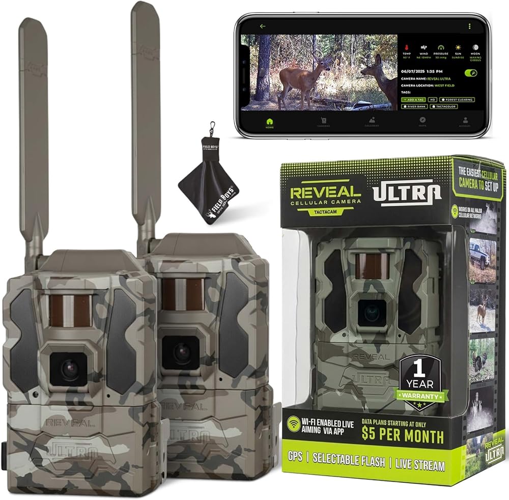 INCLUDES Two Tactacam Reveal Ultra Cellular Trail Cameras, and Microfiber Cleaning Cloth by Field Boys, a Trademarked Brand. The Tactacam Reveal Ultra is highly adaptable. It can be paired with optional accessories such as solar panels for extended battery life, and it is designed to work on multiple cellular networks, giving you flexibility in choosing your cellular provider.